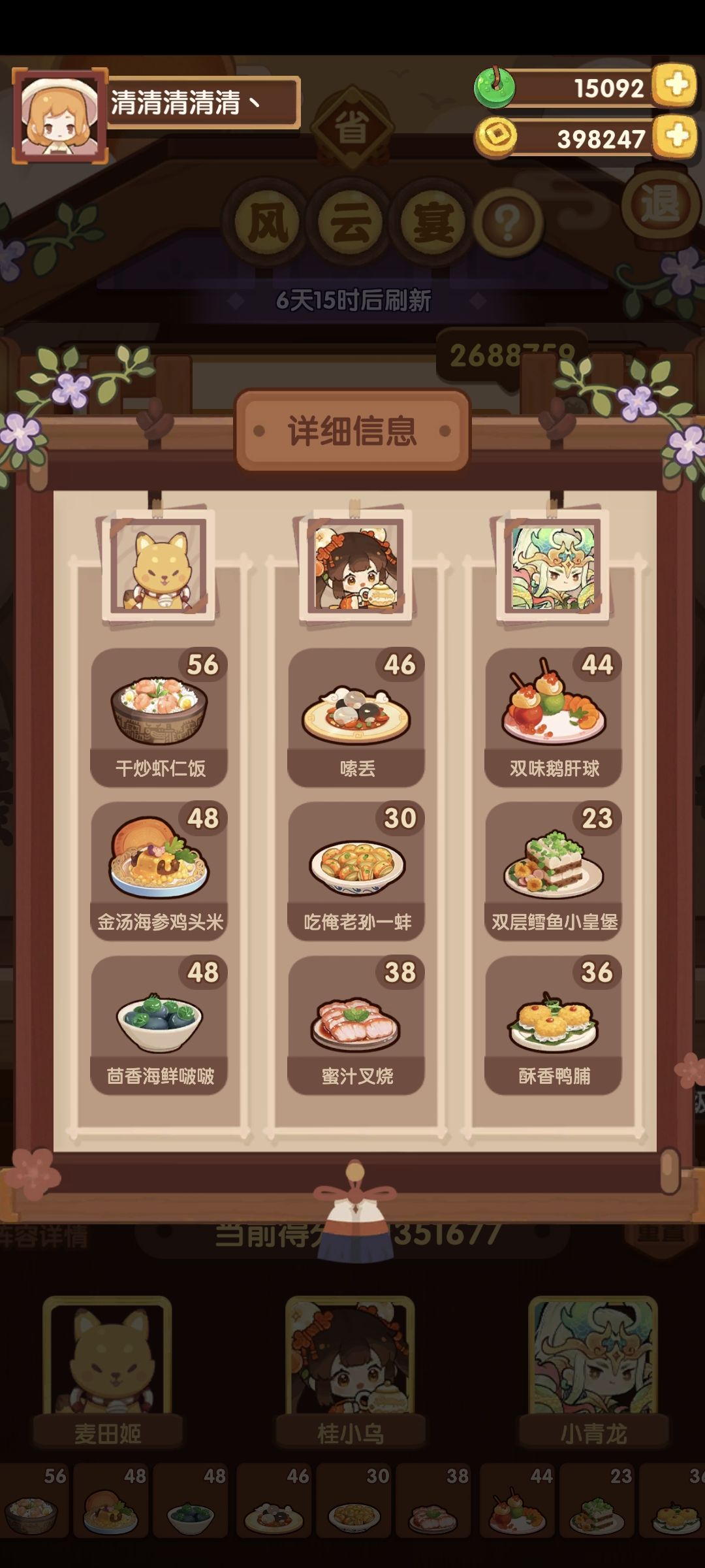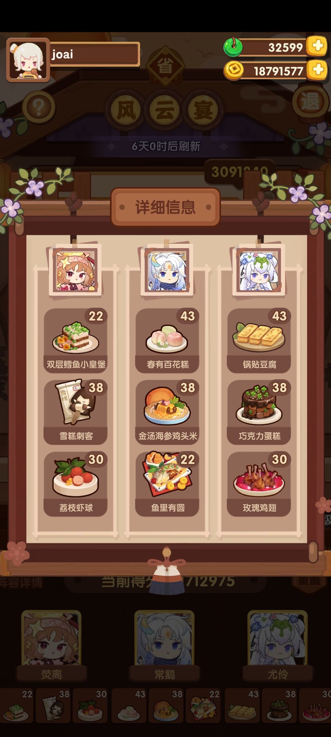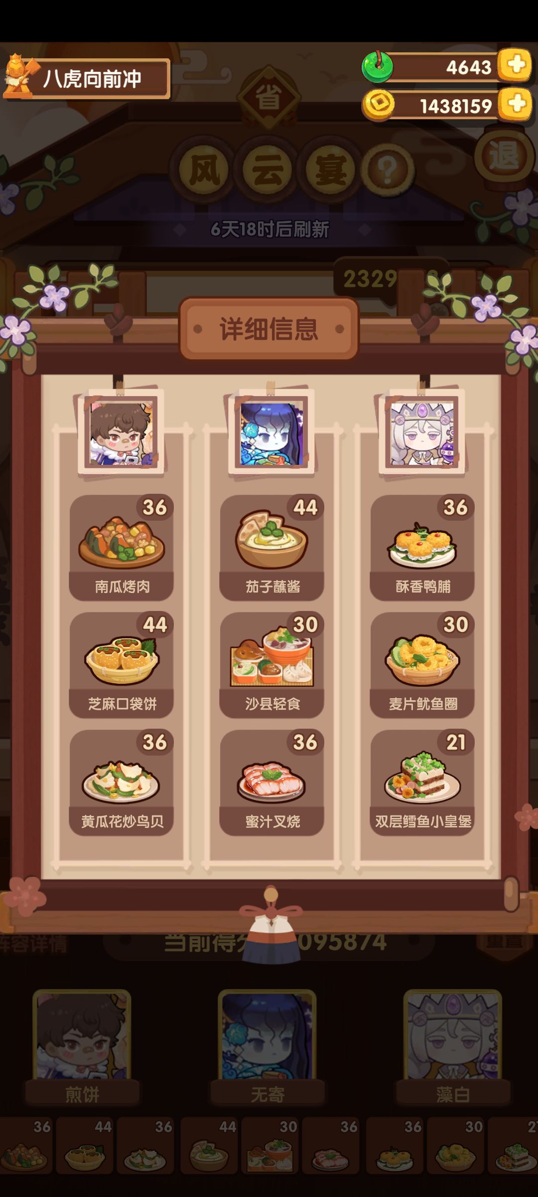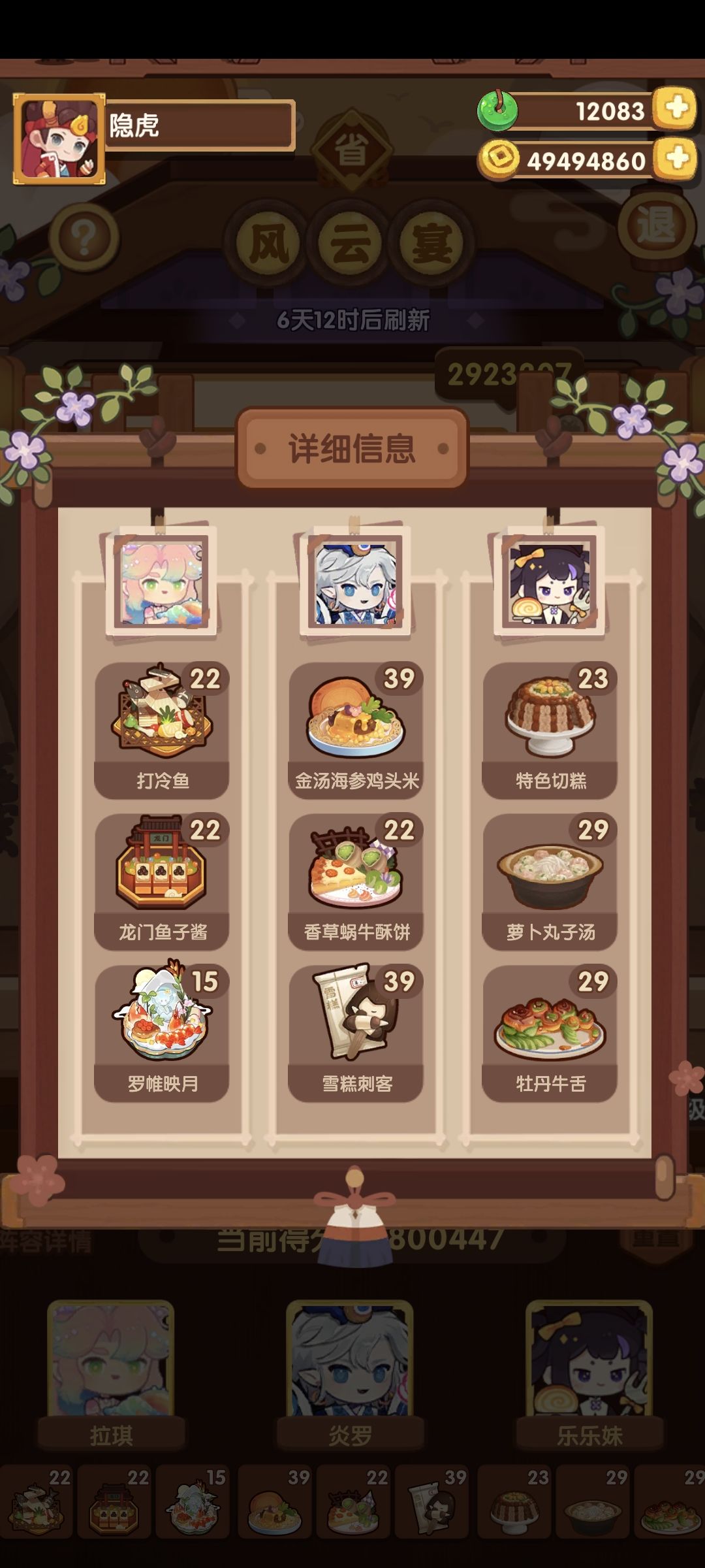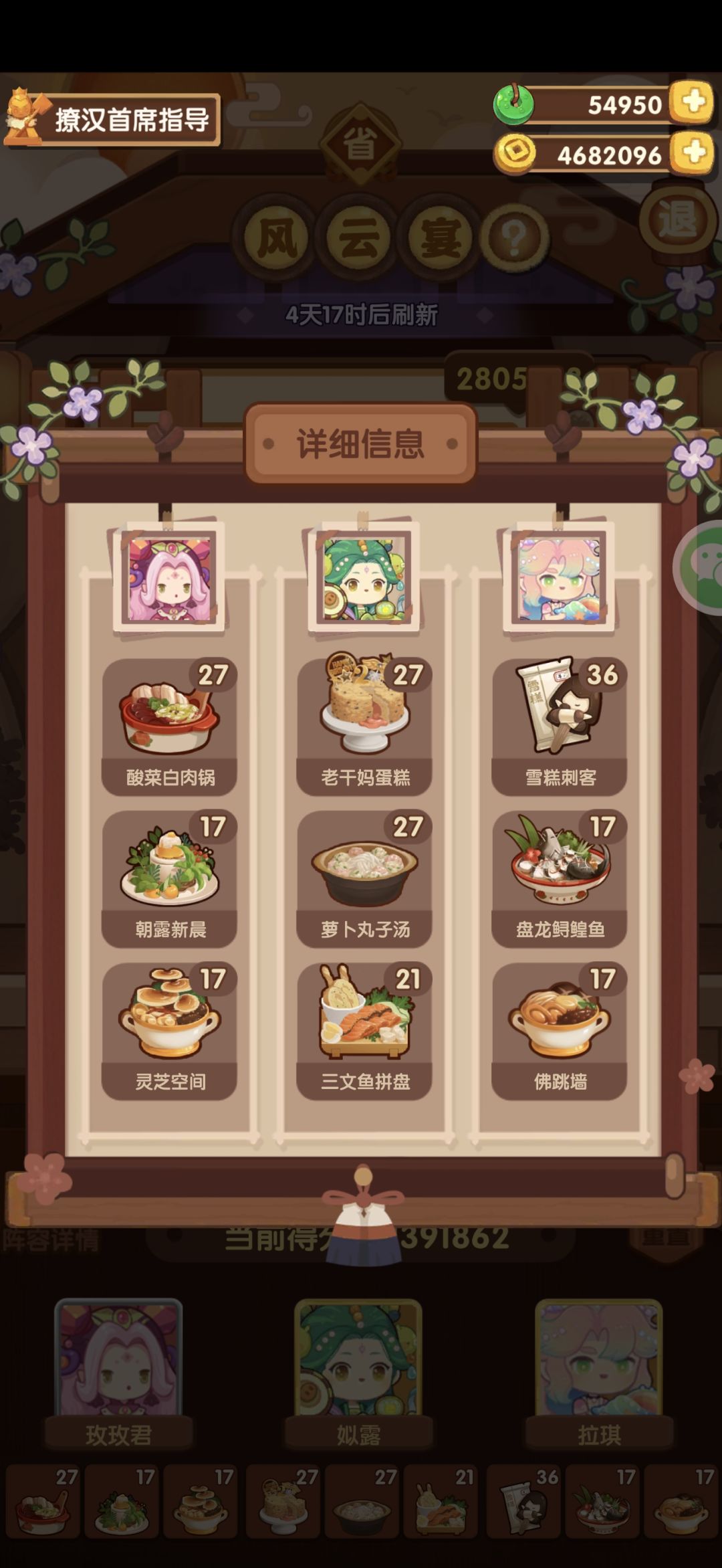 前排提醒 ①本次宴会较简单,喵喵萌新能冲五档 ⭐️该方案基修达20左右即可。 ⭐️4星上限≥2随便炒方案,可稳过。 ⭐️4星上限=1可以靠大量专精弥补。(差5万左右) ⭐️更低基修情况请自行调换更合适的(高分菜谱,高分厨师)。