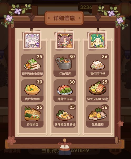 全员无厨具,修炼偏高,具体数值在P3 句茫有修炼,小公明有修炼但不影响第三棒结果。 没有年夜饭的可考虑拿其他五火蒸菜谱当替代品,因每个人的修炼进度不同的缘故,修炼不足的可能会因此导致无法拿到满档奖励,需要换的请务必先去计算器内查看后再进行修改。 无专精的情况下总分3236868。