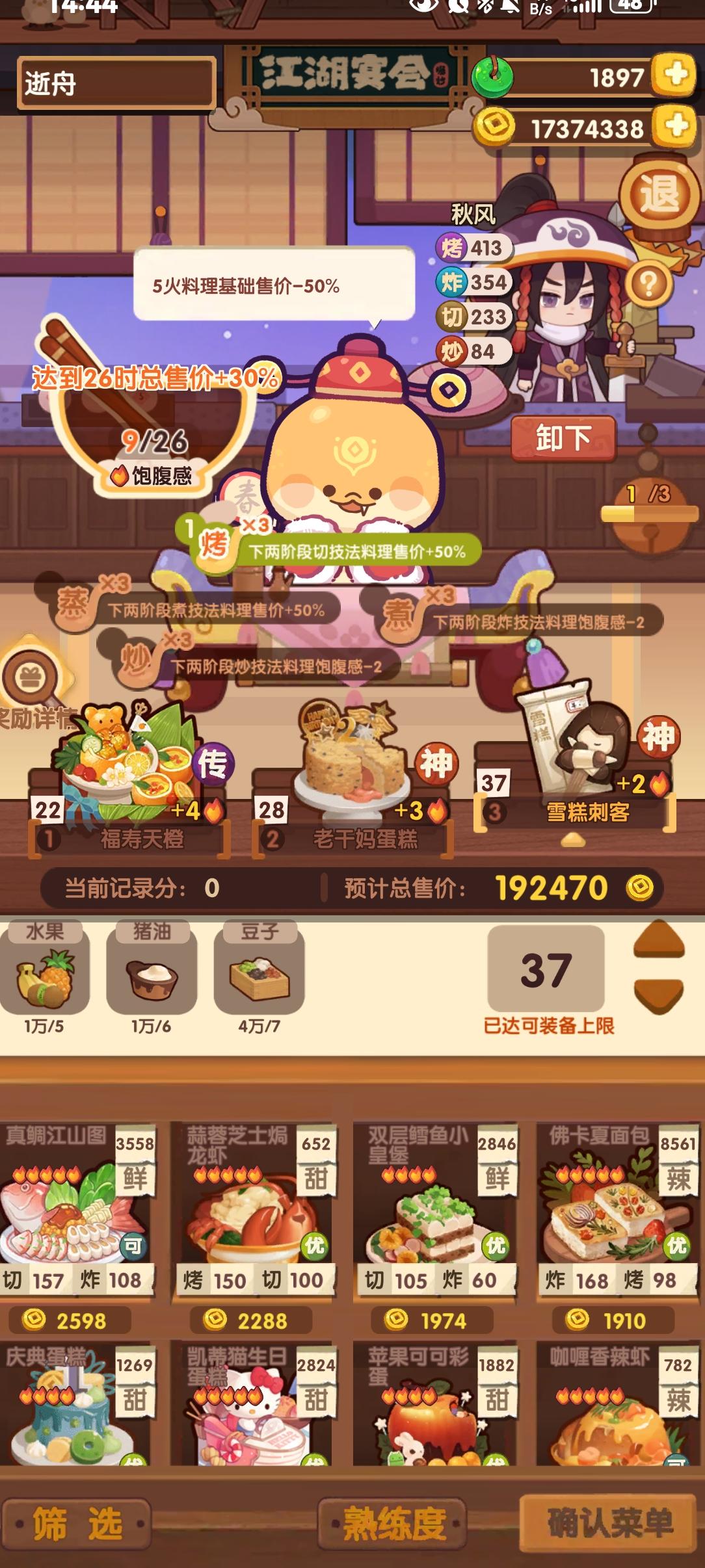那个5火菜减钱太唬人,实际上不要怕上五火,雪糕材料少我下调了数量,过线就行,第一位的香煎银鳕鱼换成福寿天橙会更高,大家按照自己的菜来换,第一位比较自由,有什么换什么,尽量让自己有的厨师的菜拿到最高就行,第二个主要就是二三四火菜轮换,主要是大宇宙,山海兜,雪糕,等等高价低火菜,根据自己厨师搭配出高分,第三位一般第二道菜常用老干妈。