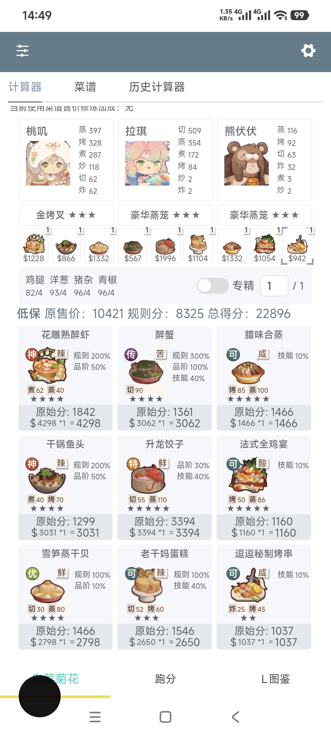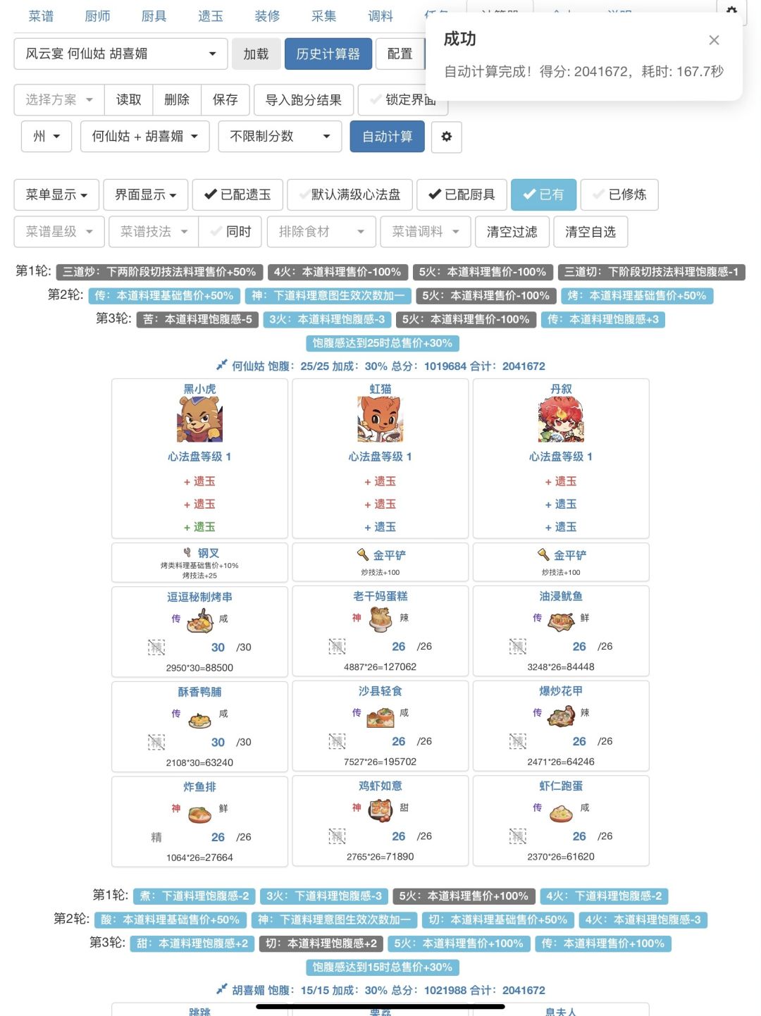 因为昨天考六级,所以作业耽搁了,宴会是根据论坛内大佬的作业稍作修改的,脑力不够只能抄作业了嘤 图1:江山池入坑可抄的一点不麻烦御前平民高保作业,莲房鱼包分嗷嗷高 图2:归途池入坑可抄的略麻烦御前平民高保作业,高分菜:热辣小火锅、围炉煮茶,其余就算没有莲房鱼包也能补全分数 图3:省级韩湘子配菜,藻白上了仙境池二火厨具,很适配,分很高 图4:省级蓝采和配菜,橙风那里可以根据自身菜谱售价决定哪个菜吃减分