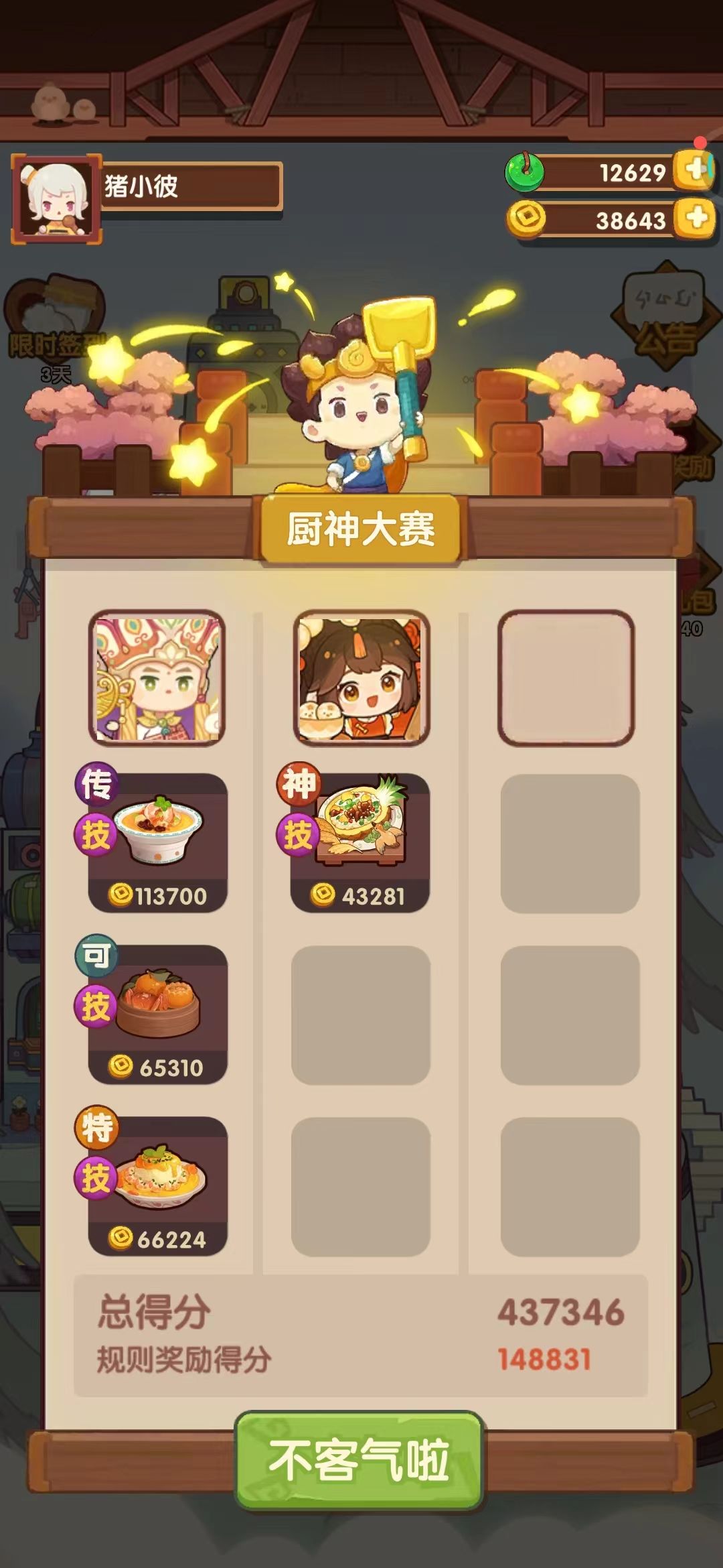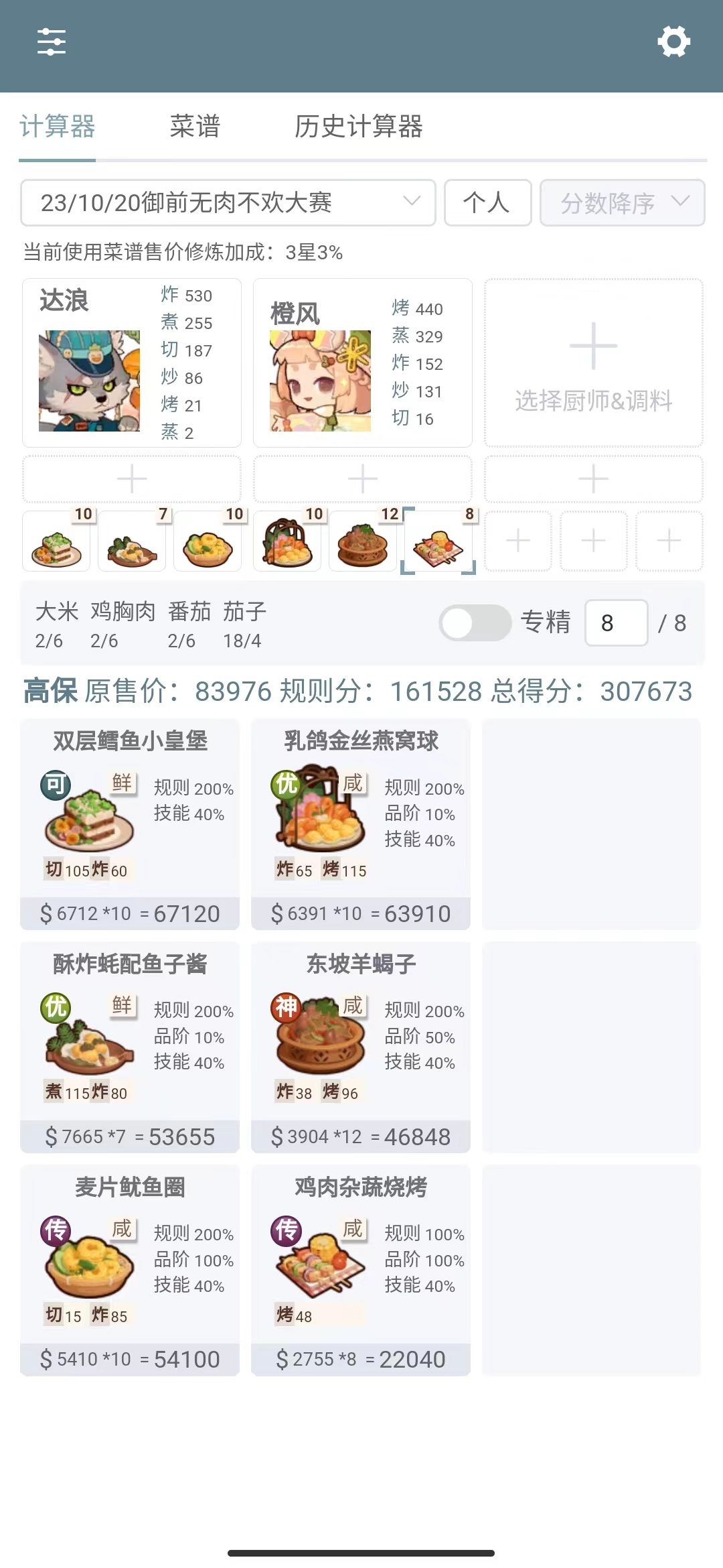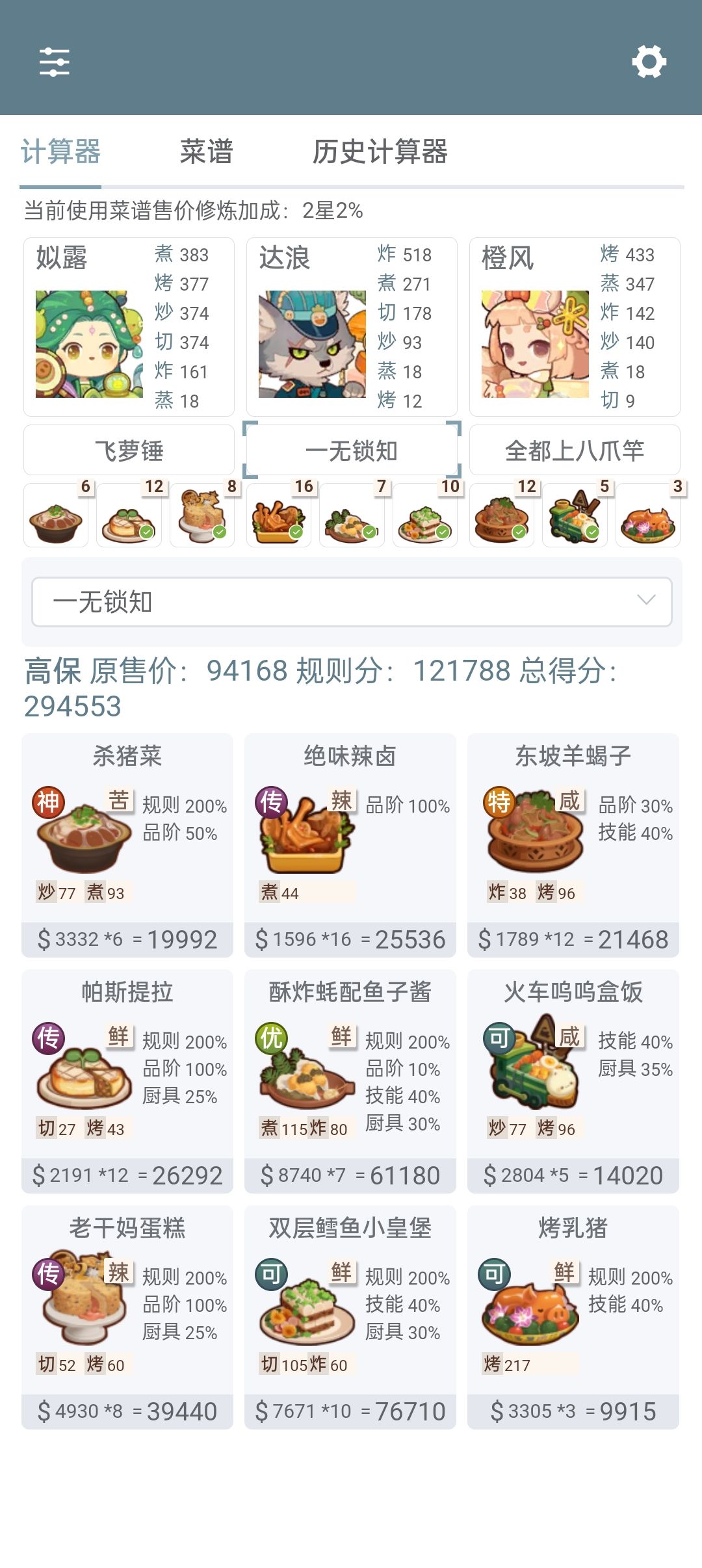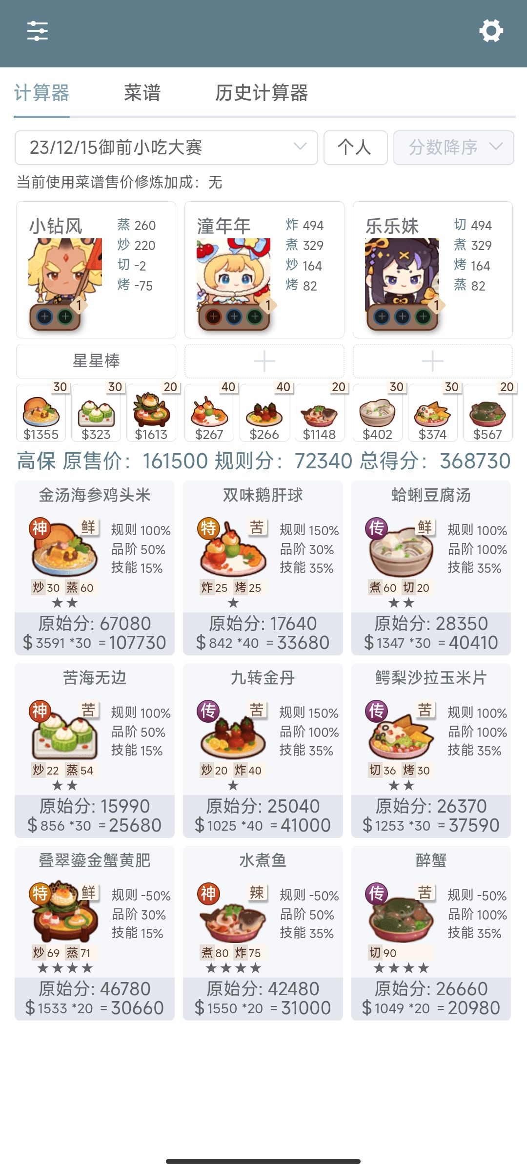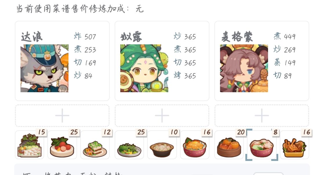 第一次御前高保没别的炒厨子了还好有送的洛竹,用了俩厨具一个加20%炒售价给洛竹一个加15%切和15%菜的给司姬。有更好的菜就不用厨具。
