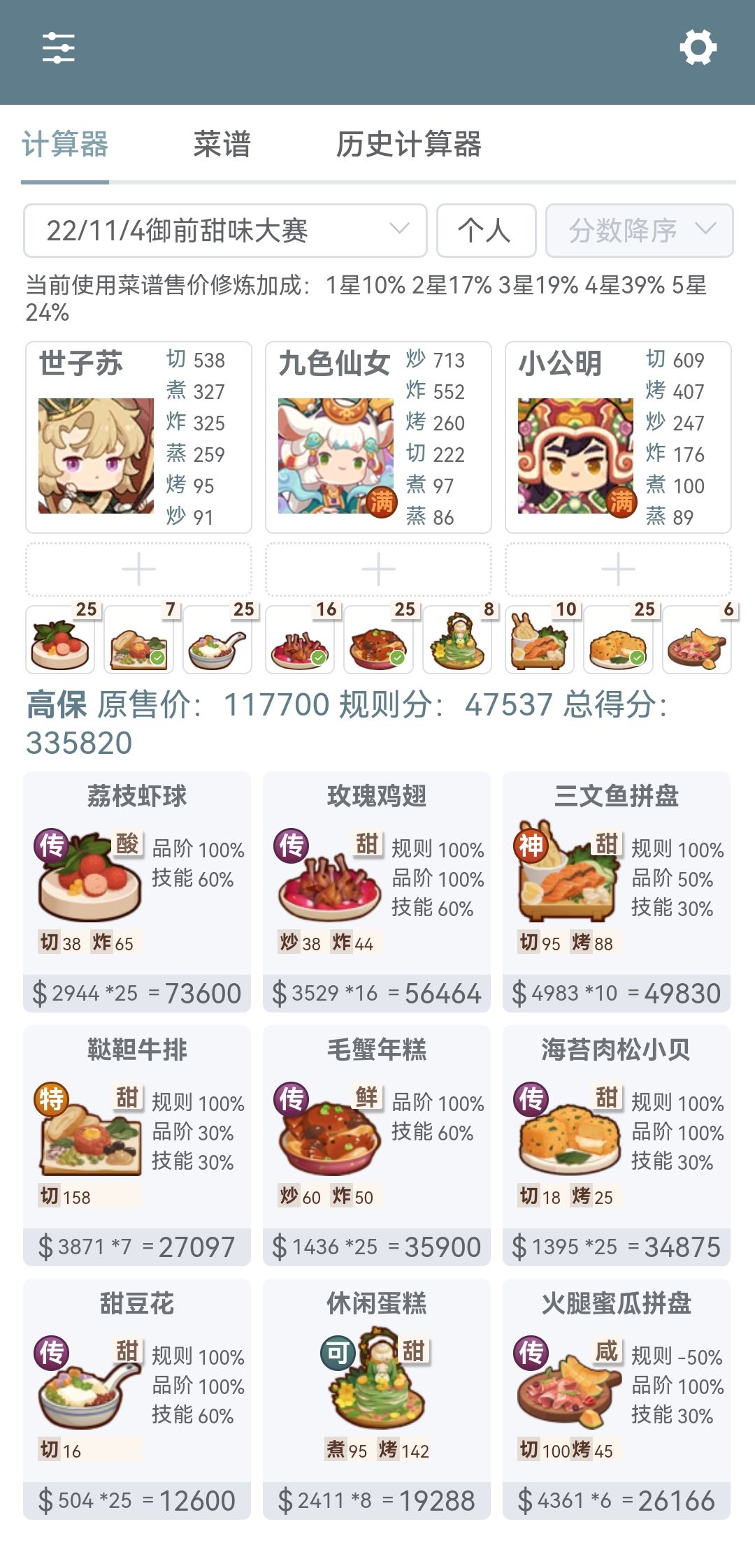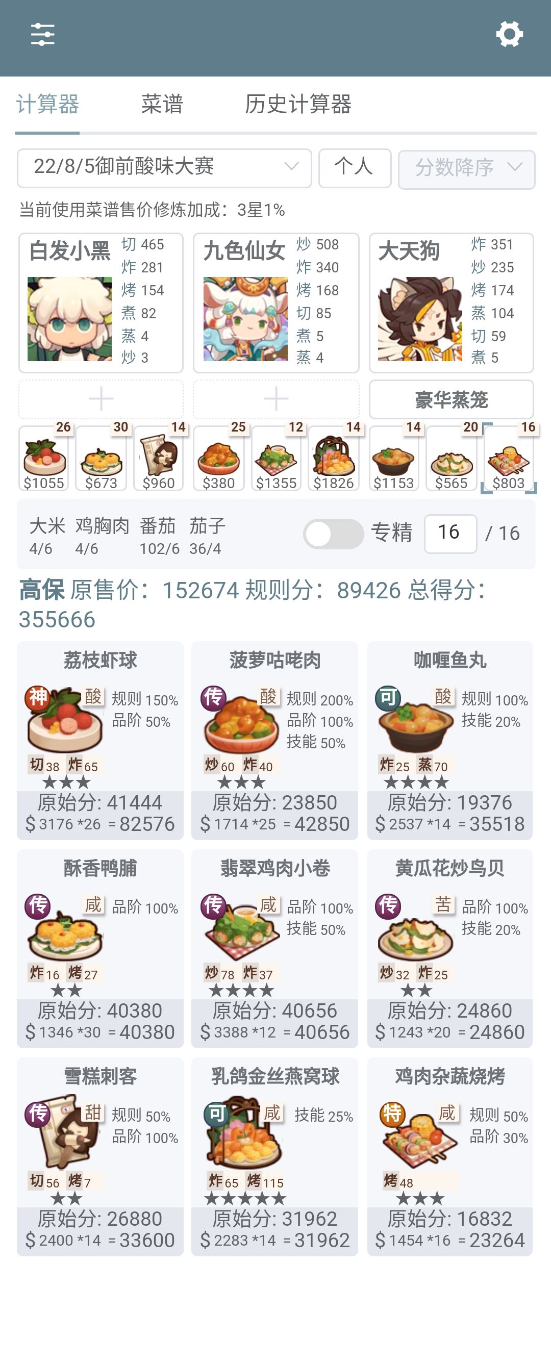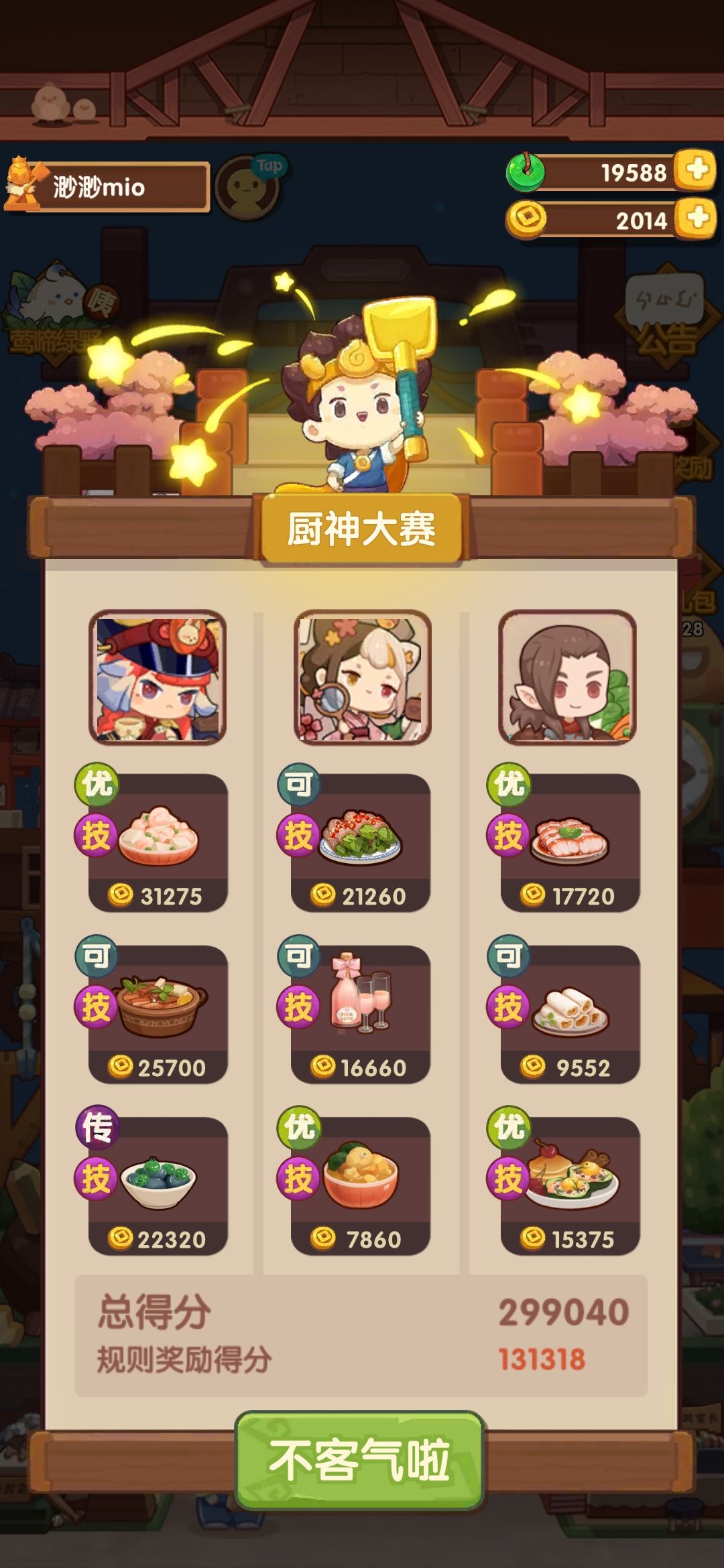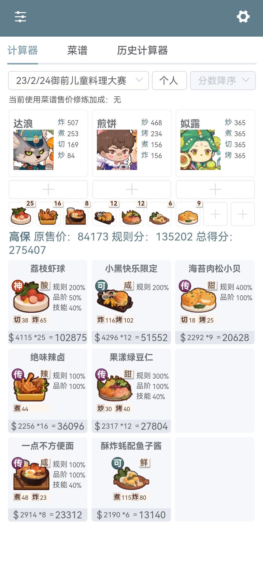 第一次御前高保没别的炒厨子了还好有送的洛竹,用了俩厨具一个加20%炒售价给洛竹一个加15%切和15%菜的给司姬。有更好的菜就不用厨具。