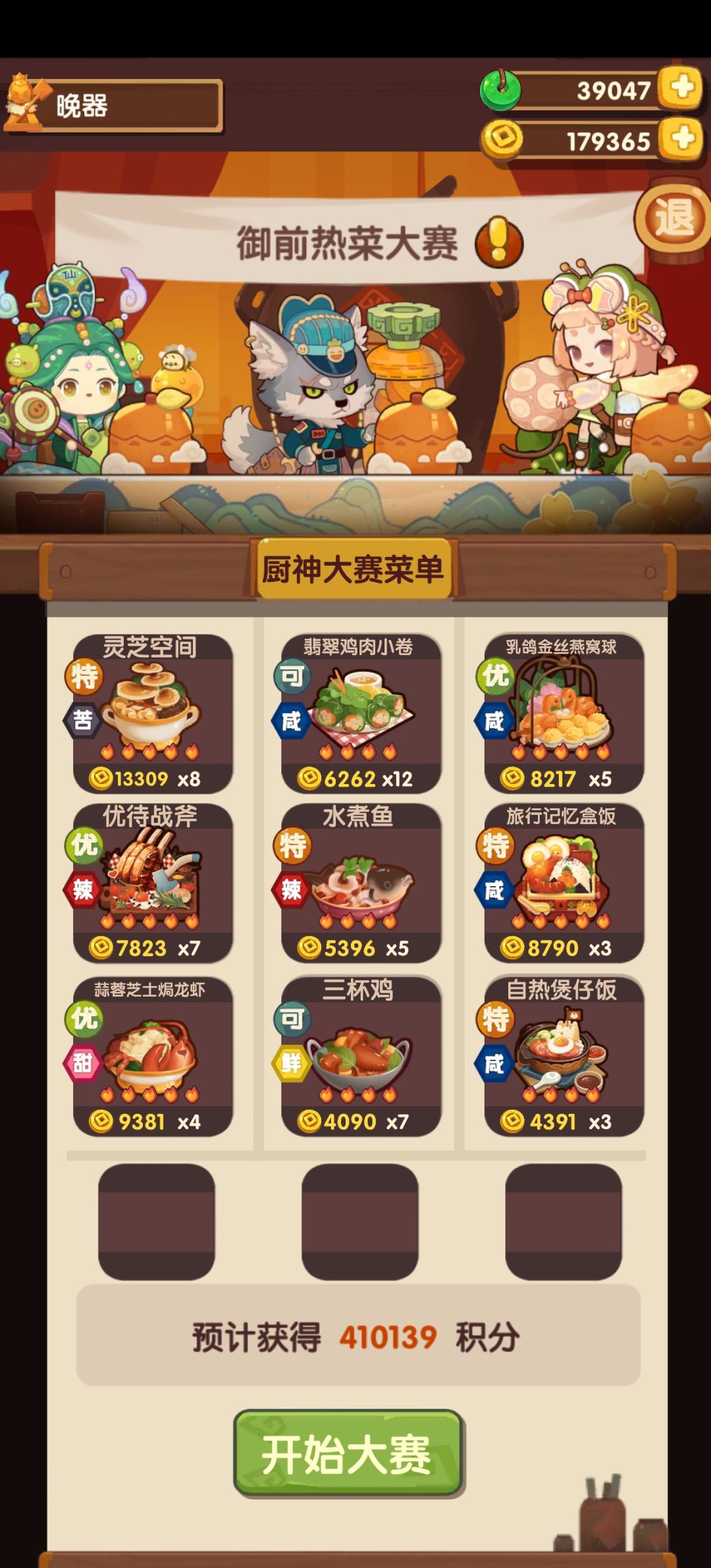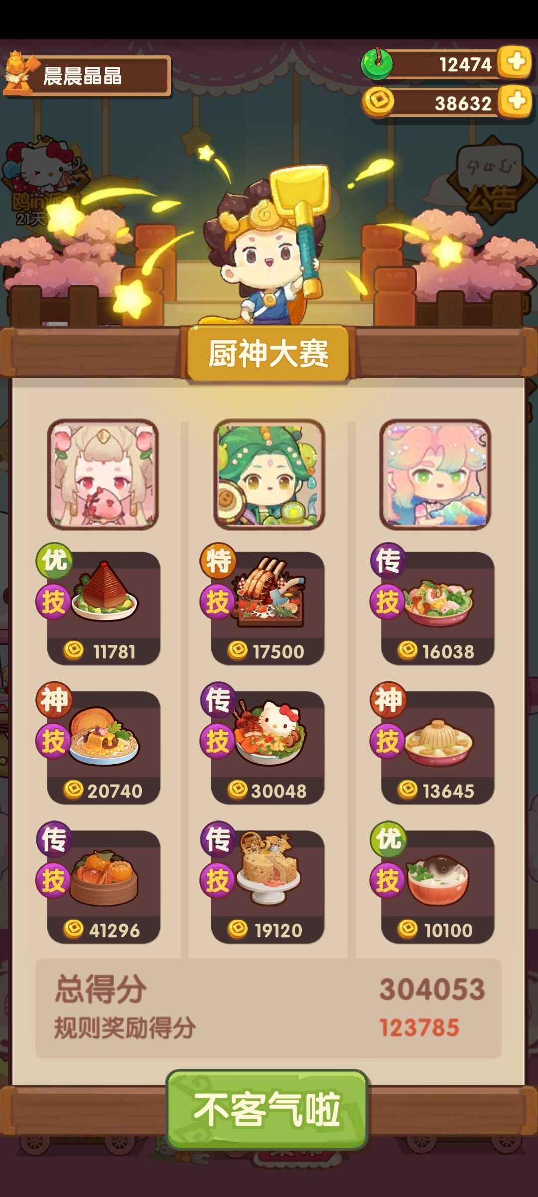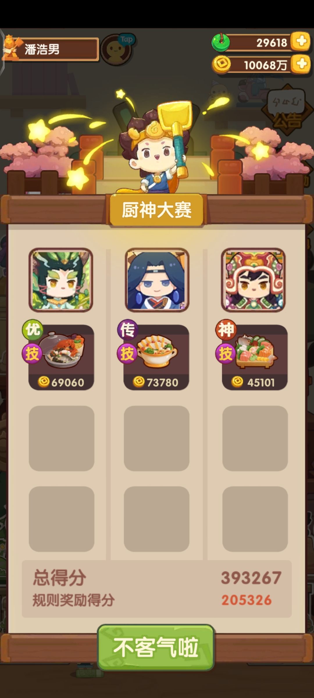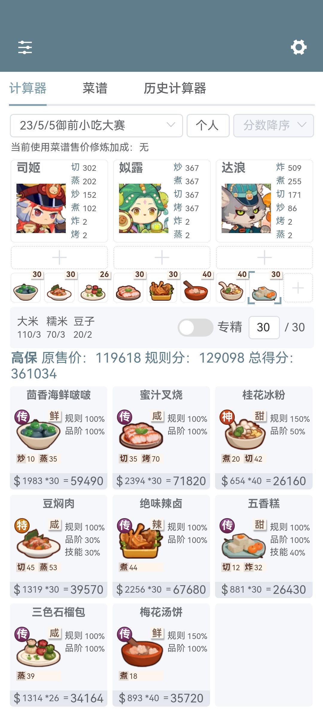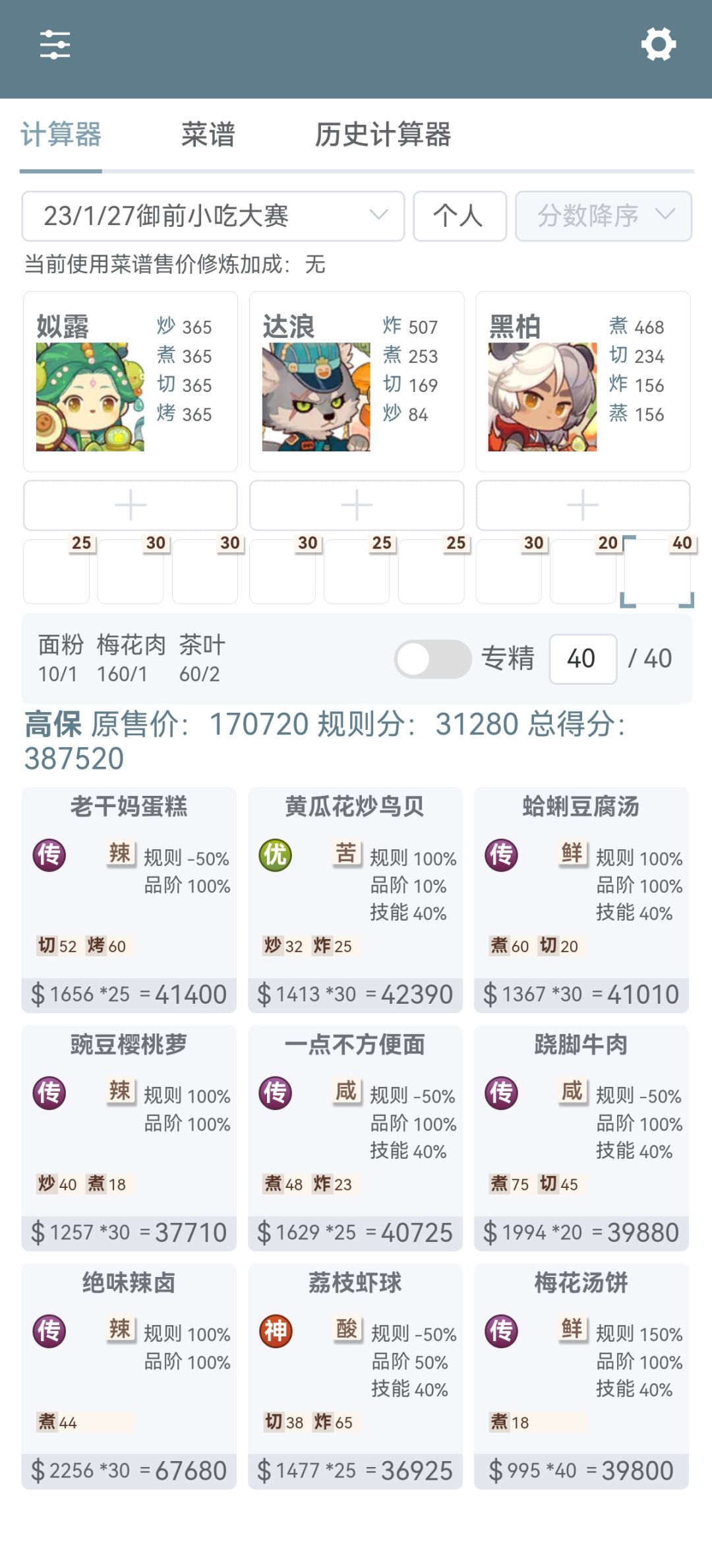 第一次御前高保没别的炒厨子了还好有送的洛竹,用了俩厨具一个加20%炒售价给洛竹一个加15%切和15%菜的给司姬。有更好的菜就不用厨具。