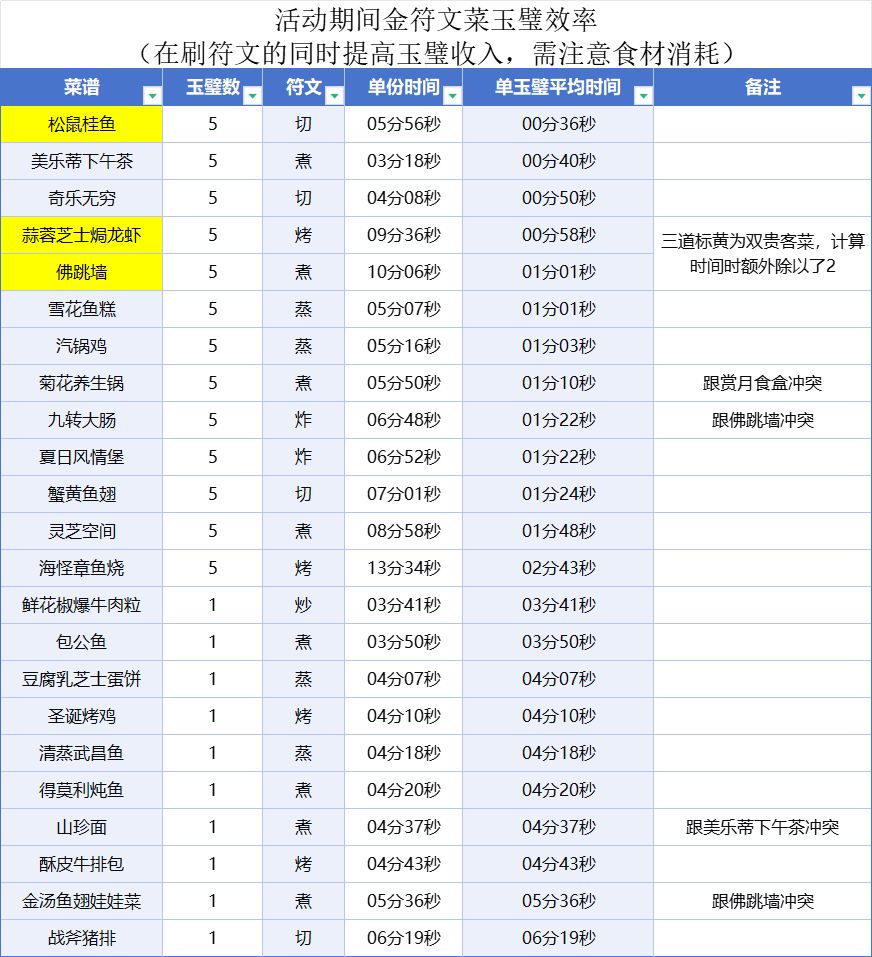 roll完一遍得出结论:全符文菜基本符合单份时长小于等于5分钟的1玉璧,大于5分钟的按菜谱自身等级赠送玉璧的规则。规则外个别比较皮的列出来了,自行参考。目前红榜:美乐蒂下午茶,奇乐无穷。