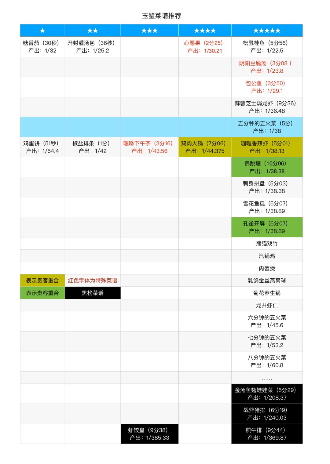 2025.3.8更新 心愿果、包公鱼、阴阳豆腐汤作废了,现在用奇乐无穷刷。 ———————— 单份菜谱时间低于5分钟,获得玉璧为1。图中红色菜谱为例外,获取玉璧数为自身火数。 单份菜谱时间高于5分钟,获得玉璧为菜谱火数。图中黑色菜谱为例外,获取玉璧始终为1。 产出是在400%贵客率、0减时下计算,为理想状态,旨在比较菜谱之间的差异。 1/32代表1玉璧产出所需32分钟。 理论支撑:https://