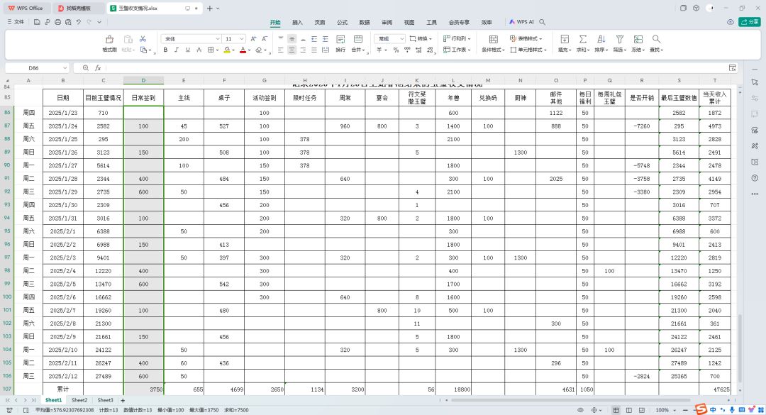 最后一次,主要是因为没时间没必要 然后就是自己在记录过程的时候会粗心 总是需要多次核对比较麻烦,以后只记录主线完成情况就行。 图片可能模糊,下面稍微总结 本次春节活动总收入47625玉璧 其中关于活动部分的: 每日福利:1050玉璧 邮件:4631玉璧 (包含除夕夜2025) 年兽18800玉璧 活动签到:2650玉璧 限时任务:1134玉璧 撒玉璧:56玉璧 希望下一年的春节福利再接再厉 由于不
