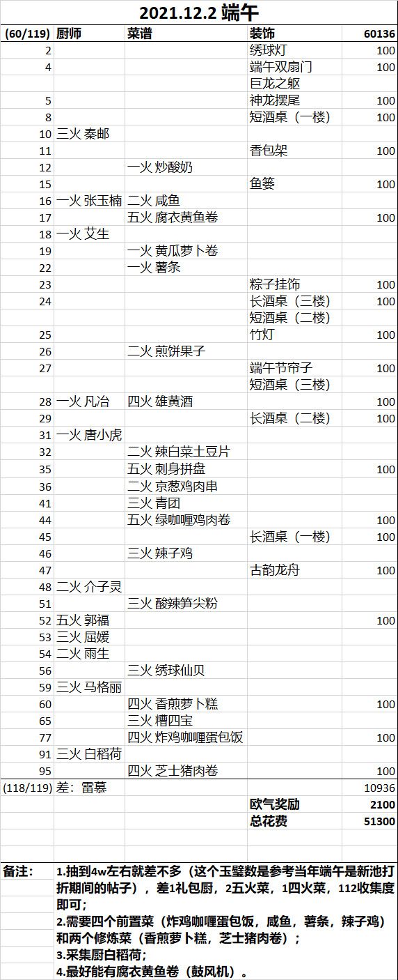 玩了接近600天的非酋玩家,入坑这么久一直听说端午毒池,巨深无比,一两百发才能抽完。但是我的四火炸修炼被端午池卡的死死的,攒了好久的玉璧,终于打算试一试! 51300玉璧,95发,收集度118/119,只差雷慕,其余全齐了!超级开心!! 个人经验: 1. 端午池有价值的东西:四个后厨/实验室前置菜,两个四火炸修炼菜,一个采集厨(具体看下表里的备注)。了解清楚后,可以根据自己需求决定抽不抽,抽到什么