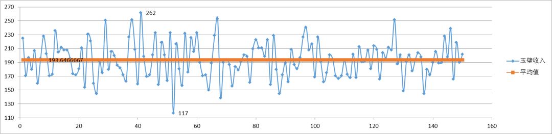先简单介绍一下众生桌子: 由图鉴网数据可以看到理论最值:最小值=90,最大值=300。那么实际每天的收益如何呢? 先上结论:实际最值区间是110~260,高概率区间是160~220。收玉概率符合期望为193.6的正态分布。 下面是统计过程: 1.根据数据计算最小值=117,最大值=262,平均值=193.6。真实数据略,可以参考下面的数据波动图 2.统计各个数据出现的次数及其概率,部分数据如下 3