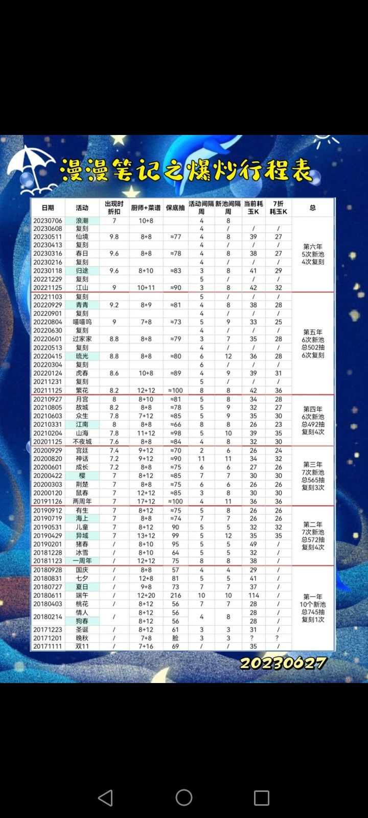 每周日常玉璧签到(带月卡)1750+厨神中保900+江湖宴州级4档580+周任务960+微博玉璧100+新桌210*7➕140➕100=6000。 而周年池开池时间为11.25,持续2-3周。因此共有7-8周时间。常规玉璧为40320-46080。再加上all in额外签到2200玉璧。此外周年池期间还会有签到奖励和,限时任务,由于数量未知暂且不算。就以开池两周计算,42520抽完去年规格的周年池
