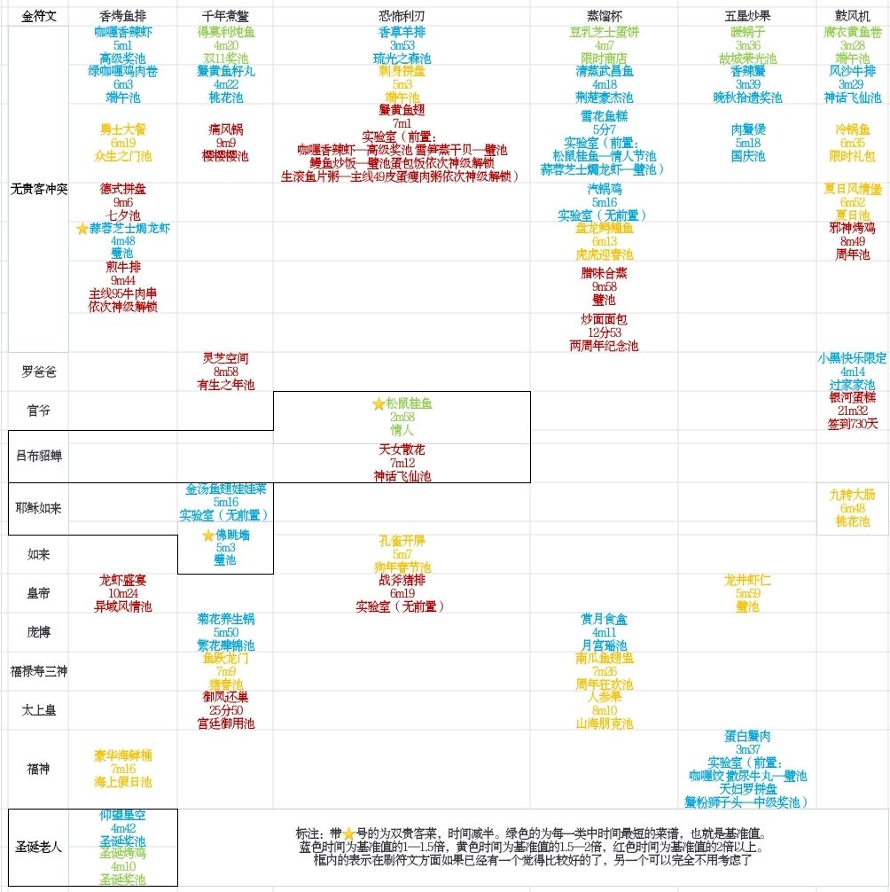 目前已经把仅有的几个厨子的修炼任务,除了符文需求其他的都完成了。再加上后厨所需符文,目前金符文空缺是795个。 如何合理一点的把这几个符文刷出来呢,我做了一个个人向的表格。 上表的基准值也可以根据自己已有的菜谱来设定 假设符文率是在50%上下浮动 1.5倍的情况为50%±10% 60%/40%=1.5 (浮动10%/50%=20%已经非常大了)也就是说如果菜谱的贵客率都在40%到60%之间,那么高