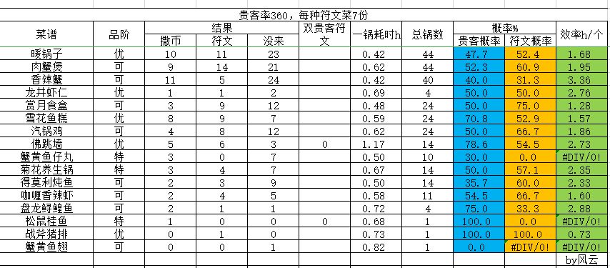 话不多说,直接看图,本表中的概率、效率不计算暴击,但计算效率时计算双贵客符文。样本数据还不够多,后续有更新再发。