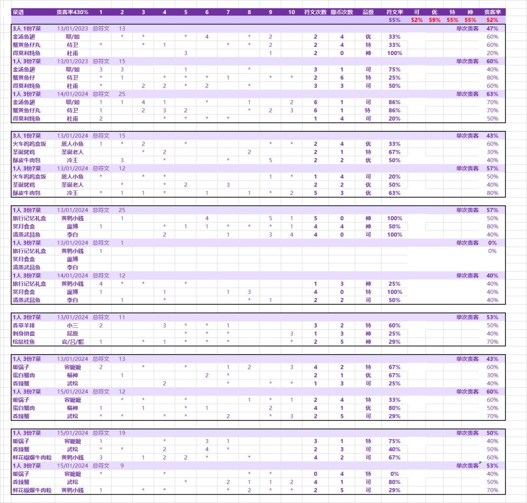 2.5万玉璧加速, 11/01/2024 每组刷7*7,49份. 没有记录,撒币率非常高. 12/01/2024 七组,每组7*3份,撒币率越有明显有降低. 不足遗漏之处,还请大佬留言指出. I 菜品等级与符文率 目前结论: 【12/01/2024】 可54%/优49%/特50%/神51% 【13/01/2024】 可53%/优49%/特62%/神55% 【15/01/2024】 可52%/