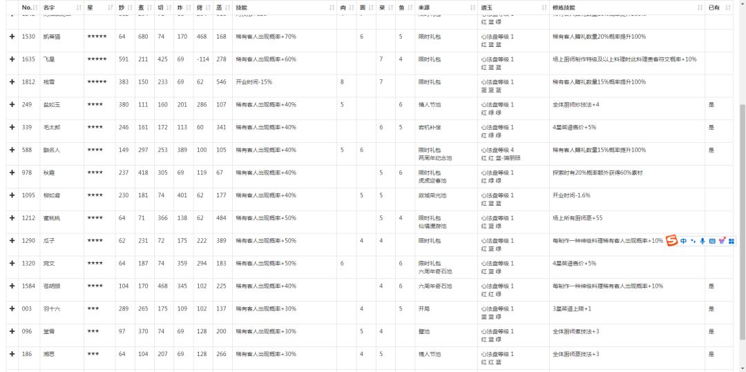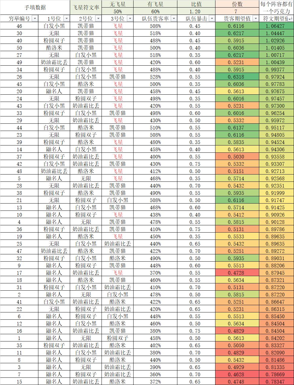 图一,据黑翼之龙大佬建议,给没有无限或酷洛米的阵容配备一个巧克力礼盒,使配队数据更加合理。 关于符文配队,我收集了无限酷洛米飞星和其他五位暴击厨的数据(图四),穷举做成了数据总表(图二)。 不过飞星的符文率数据一直没有,所以这部分可以手填。 另外,图三所在的表格可以选择厨师配队或修改数据。 图五,通过控制变量的方式,引入未修炼无厨具的飞星,量化装备不同厨具的厨师的符文能力。当飞星的提升能力在大于1