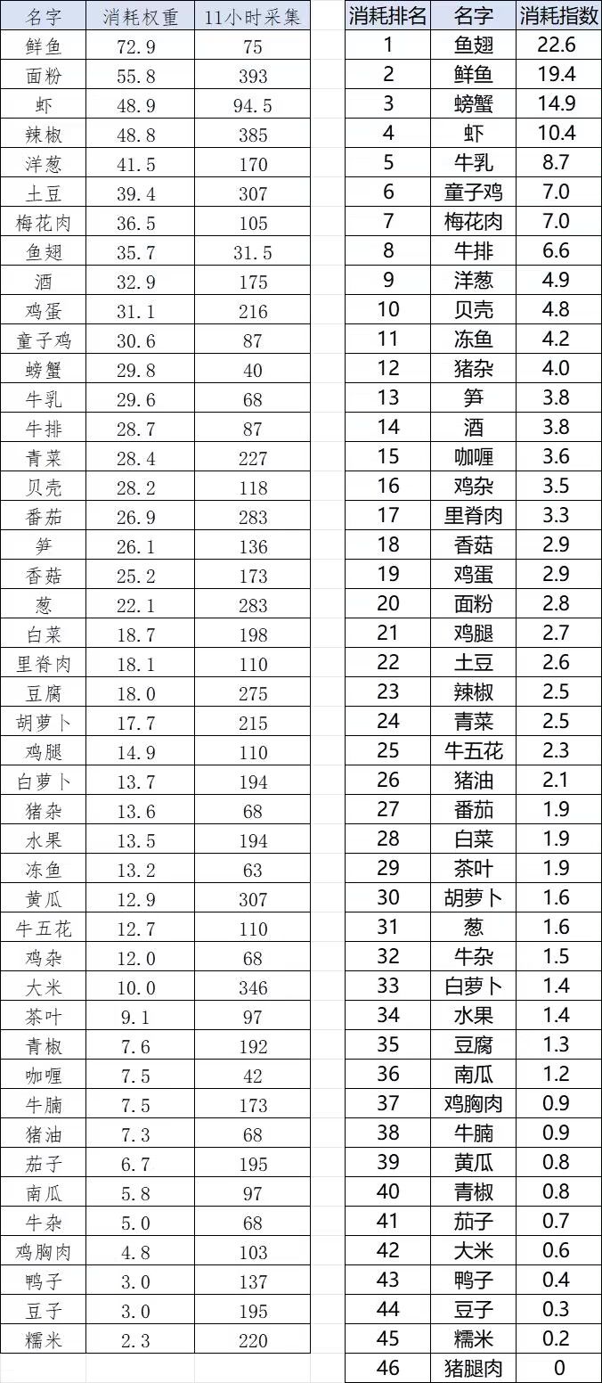 今天突发奇想算一算金符文菜对材料的消耗,看哪种材料消耗得快。 两个结果让我惊讶: 1,很缺的鲜鱼和牛奶只排第2和第5。 2,金符文菜不用猪腿肉。 计算方法是用这个菜的耗时为主参数计算权重值1(0.5+1/耗时),权重值2考虑无冲突菜等因素。然后把所有符文菜的各项耗材数乘以两个权重,得到的这个值叫【消耗权重】。如图左侧。 再除以此耗材的产量,值叫【消耗指数】。如图右侧。 最后降序排列。 不知道这种计