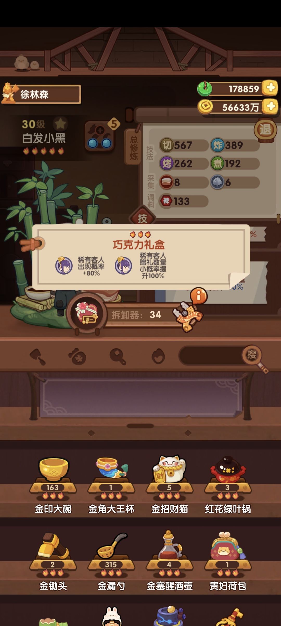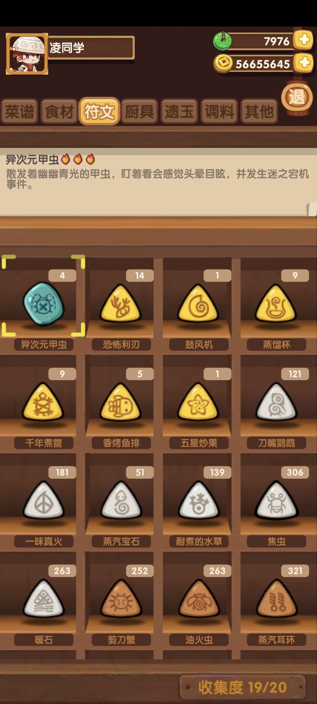 这次活动期间用松鼠桂鱼刷玉璧,统计了一下符文与玉璧的概率,做菜是优级,每次7份,总共统计贵客来了175次,撒符文103次,概率大约58.86%,刷到后边基本就稳定在这个数字上下浮动不超过1%,这个数值跟之前大佬公布的51%可能有些出入。昨天发现凯蒂猫上厨具之后可以做到可级,活动后半段决定用可级刷玉再统计一下。