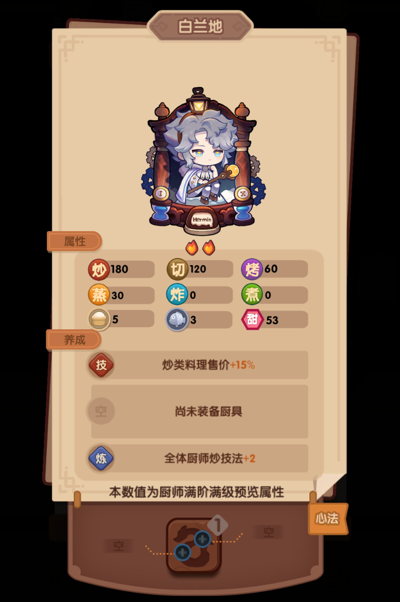 罗师傅切售价+50所以优先考虑切菜了 第一阶段只有一个售价意图,所以上三蒸或三煮打辅助更适合一点,蒸煮菜杭三鲜,酸菜白肉锅,乌骨鸡米饭获取都很简单,厨子的话可以上黑风 第二阶段意图要的酸鲜苦很适合煮切发挥,可以选择老板或者山肴,搭配宝山飞龙,红酒牛舌,没有苦菜可以上小红花 第三阶段意图还是苦,可以炒蒸厨上烧麦和烂鱼冲树 第四阶段很明显的老干妈鳕鱼堡主场,一般选择雪糕刺客或者真鲷江山图作为补位菜,悲