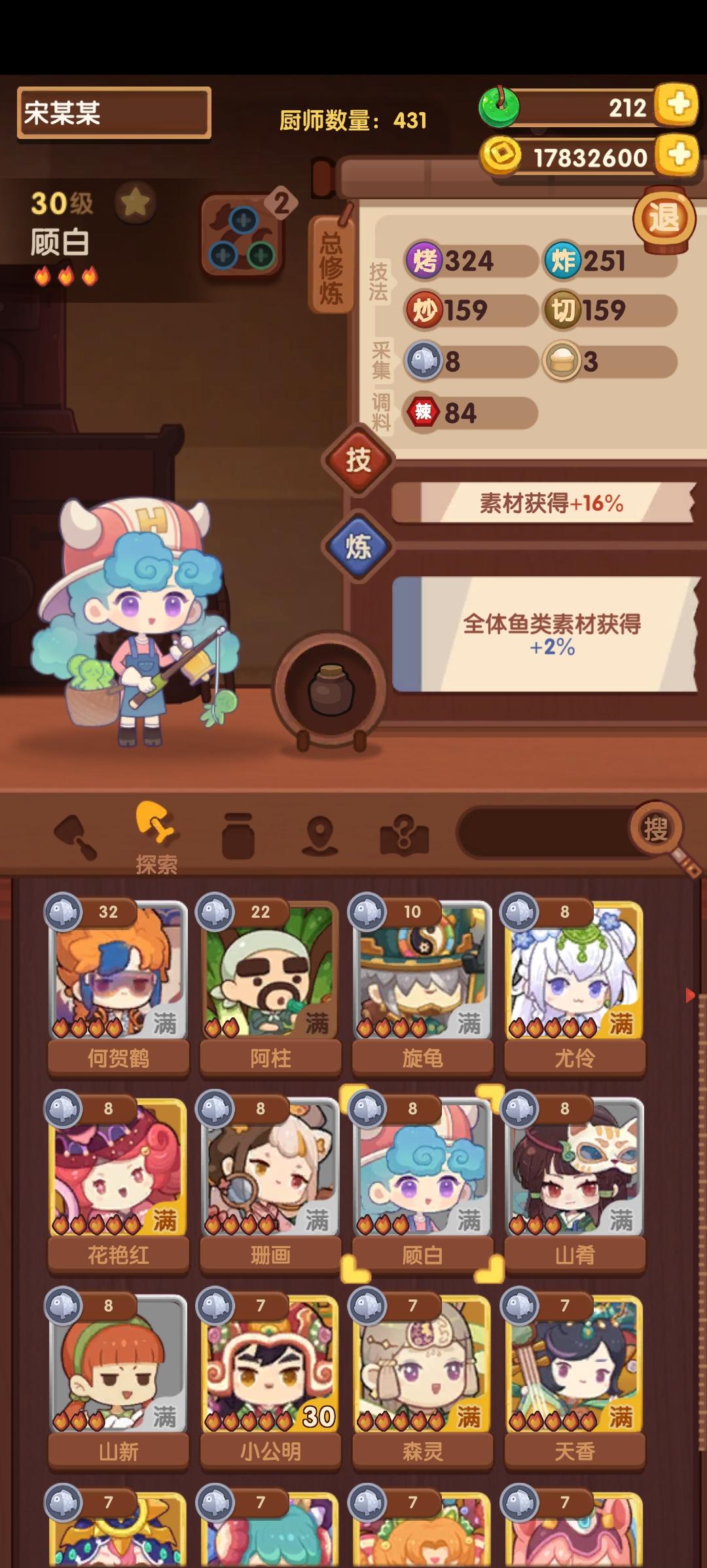 原本以为混沌子还不能撼动苍胡颉的位置,结果一算 居然+18% 能达到340% 如果我的理解能力和计算方式没错的话,不过混沌子养成挺高 其中满朋陨难获得。 还好我调料已经弄完不需要装石头、玉片采集还差一些石头(需要一二火),但为了贵客率其实也可以暂时放弃玉片采集直接分解掉这些石头进行合成满朋陨 就看混沌子最终的技法怎么样了 其他厨师的话,礼包厨没钱买不看。 樊声不看 秋风不看 二郎神不看 为什么不看