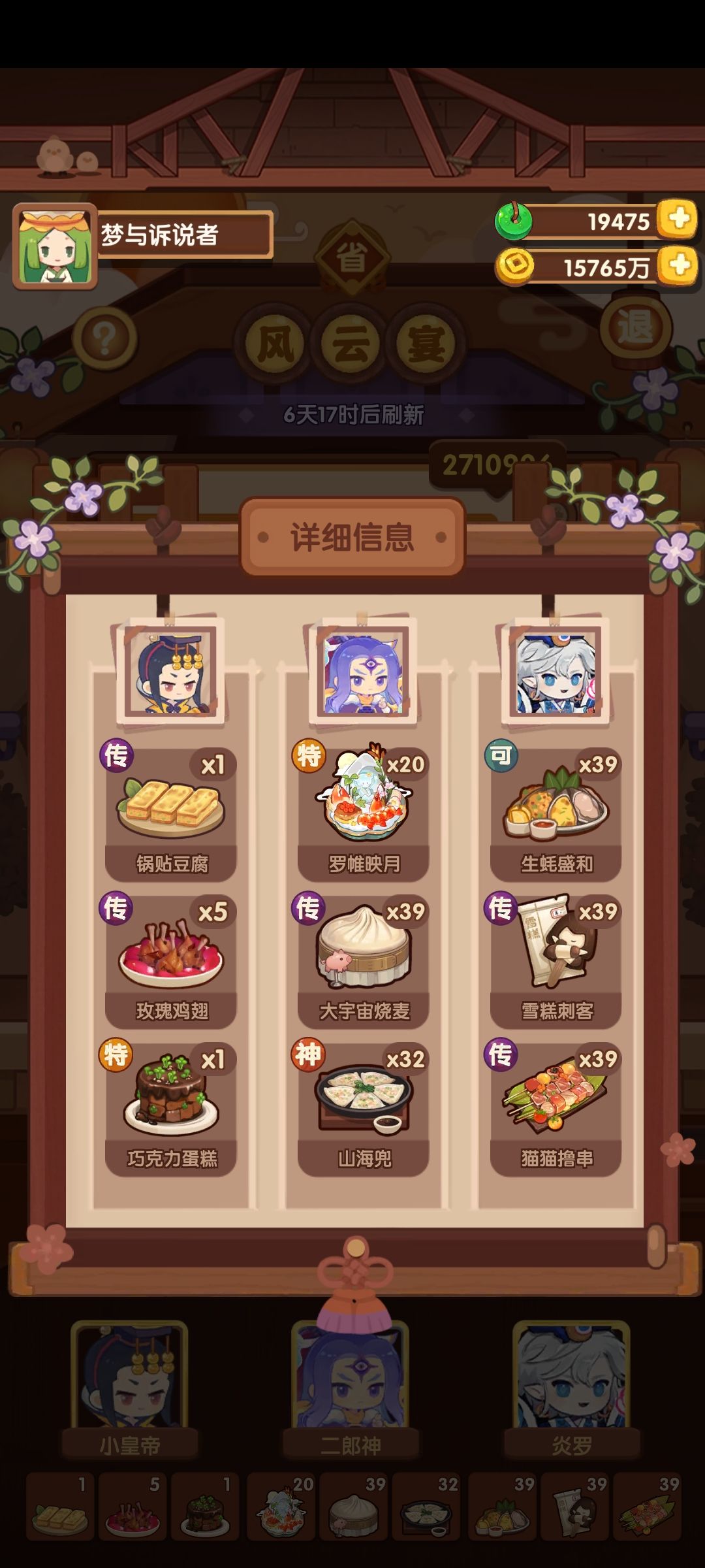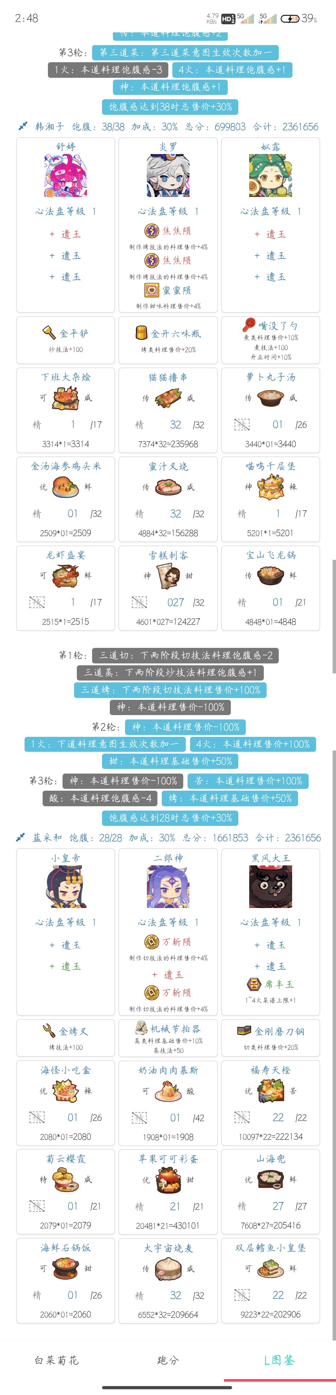 饱食比较难凑 小皇帝 二郎神 小鱿 镇妖是修炼了的 还是建议大家自己先算一下,自己的池子情况自己最清楚,打开图鉴网 按照意图,参考大家的思路,大概抄一下再根据自己的情况微调,实在不行再求助,不然一直也搞不明白是怎么算的。 一号位 选一道酸味的菜 后面跟一火或者五火 根据自己情况来, 我没有“杭三鲜”有的可以上 二号位,不能有做到传说级别的菜,避免减10饱食度,所以这里把二郎神的厨具换了,也可以