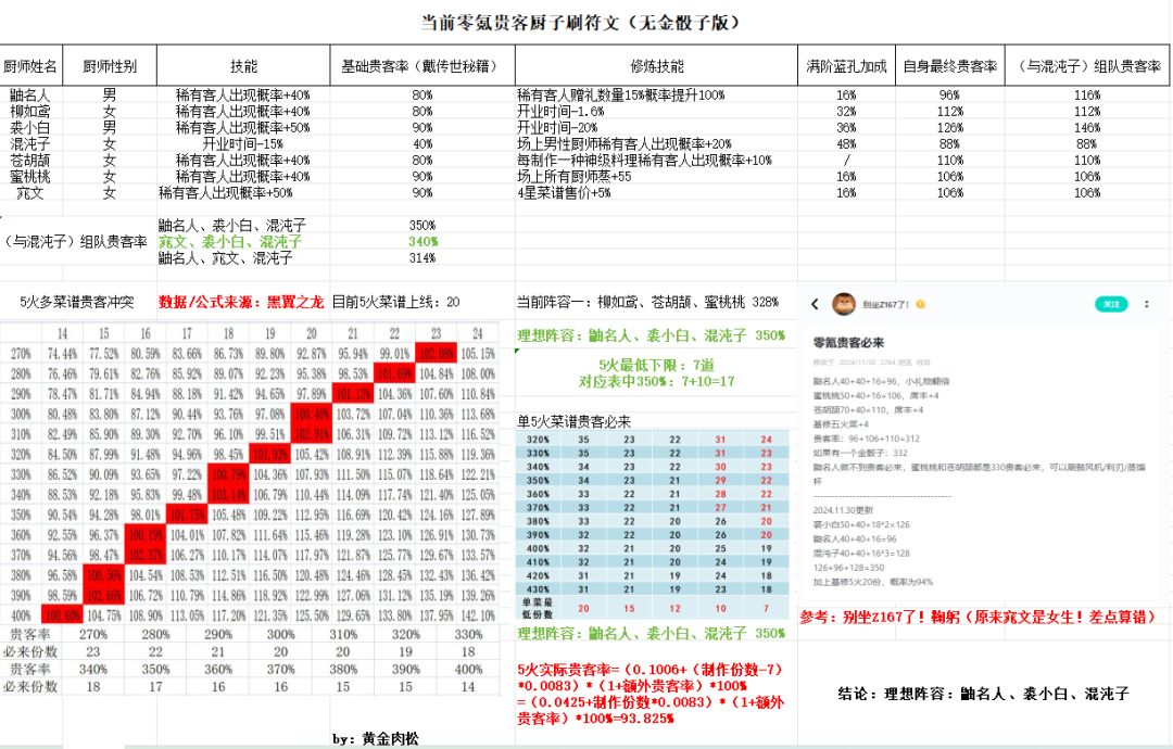 中午没休息 整了个零氪贵客表(无金骰子版)晕了[表情_晕了] 感谢两位大佬 珠玉在前微笑[表情_微笑] 如有必要可参考~大笑[表情_大笑] 补:达到此贵客率需6个满朋陨(自己差3) 堵石需谨慎,我打算直接分裂、合成酷[表情_酷] -2025年2月3日修改- 裘小白为坑厨,保底为181发,若未抽坑,按当前折扣,需74210玉璧;若其他厨师、菜谱已出,大概仍需4.2w+玉璧。 -2025年3月5日修
