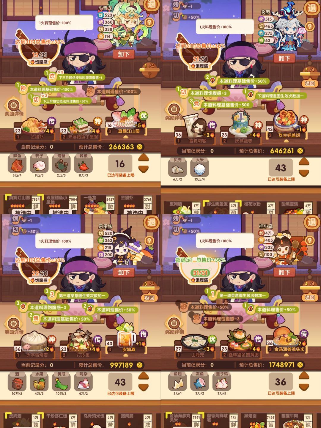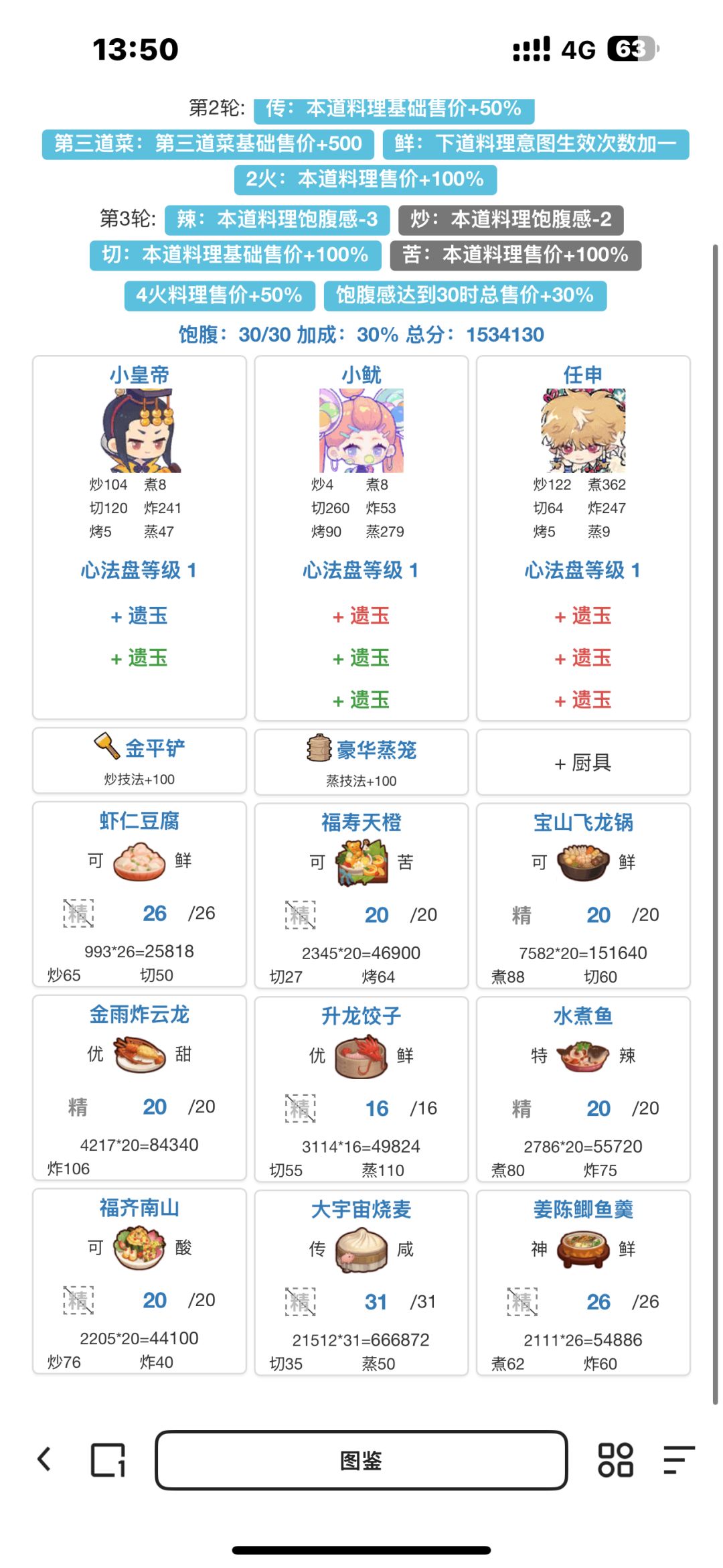 还得是有计算器 更新了不上玉的方案 饱食度要求高,没有什么加饱食度的意图 五火还减售价 全场传加售价 对菜厨要求比较高 小团体只能吃到一点点,全场售价意图,所以很难, 也很正常,毕竟最后一轮,菜厨只是游戏一部分,还有修炼,遗玉,调料。 更早入坑 有杭三鲜 山海兜 可以试试 二郎神 小皇帝 小鱿/冬鸦 黑风/吴刚的组合 会容易一点 这个作业很大概率也没办法直接抄满档。 不上玉我手算也没算满,可能贪