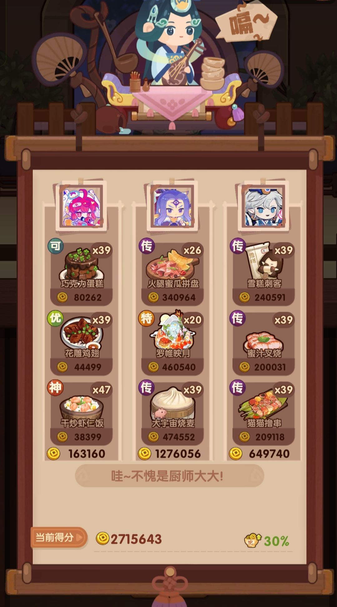 无实验室后厨菜 全是周年池之后的菜 应该比较好抄 就一个特别需要注意的点二号位厨师 用蒸切厨 一定确保大宇宙烧卖能做到 “传说”级别(二郎神 冬鸦 小鱿之类的都可以) 第二道鲜 前两道菜不要上二火,不要做到传说等级,让第三道菜 大宇宙烧卖 叠加三个意图。 1号和3号位厨师可以根据自己情况换 尽量吃售价意图 满足饱腹要求就行 主要得分是在二号位 建议大家还是自己先尝试下,这个配置很低,有上位厨师菜