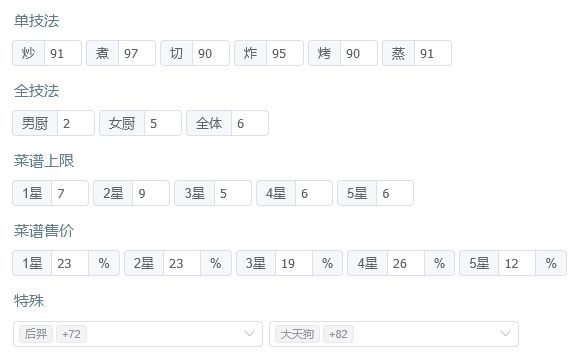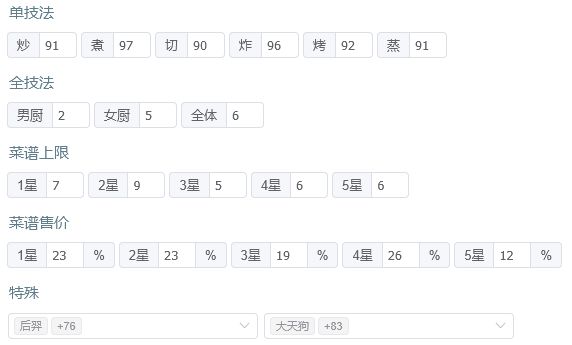先参考下吧 一版有黑风 一版没有 厨师都修炼了 因为是靠二郎神切售价光环 所以一轮上三个烤 就行 后面两轮就是用三火的切厨 根据意图上相应的菜 没什么特别需要注意的 纯二郎神数值怪 第二版中间上冬鸦比小鱿要高些 具体根据自己菜谱情况来吧 二郎神100烤叉 冬鸦 100切 小鱿 100蒸笼 黑风20水产售价 差分可以补售价厨具 厨具是之前带的 可以等计算机出来试一试
