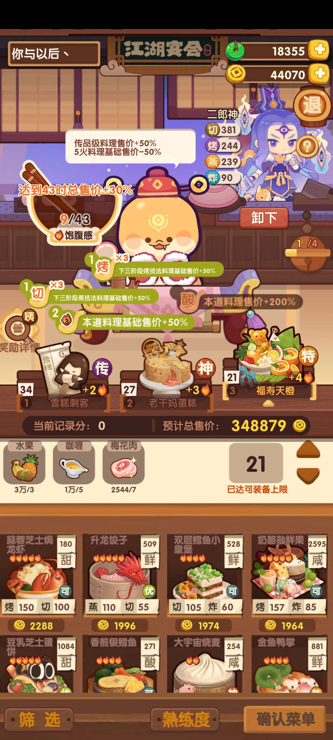 1火+100,作用不是很明显,但至少没有debuff 第一阶段很明显的老干妈主场,二三号补高价菜或饱食度,没有烤切厨可以悲歌上烤叉勉强用用 第二阶段意图煮切优势比较大,当然没有的话蒸煮也不是不行就是要注意一下饱食度,建议顺序是2火,宝山,高价菜,2火可以根据饱食度调整为切菜或者非切菜,进而影响切+3buff是否翻倍 第三阶段两个技法无关售价意图,走炸切上鳕鱼堡或者走蒸切上烧卖都可,要注意前两号不要