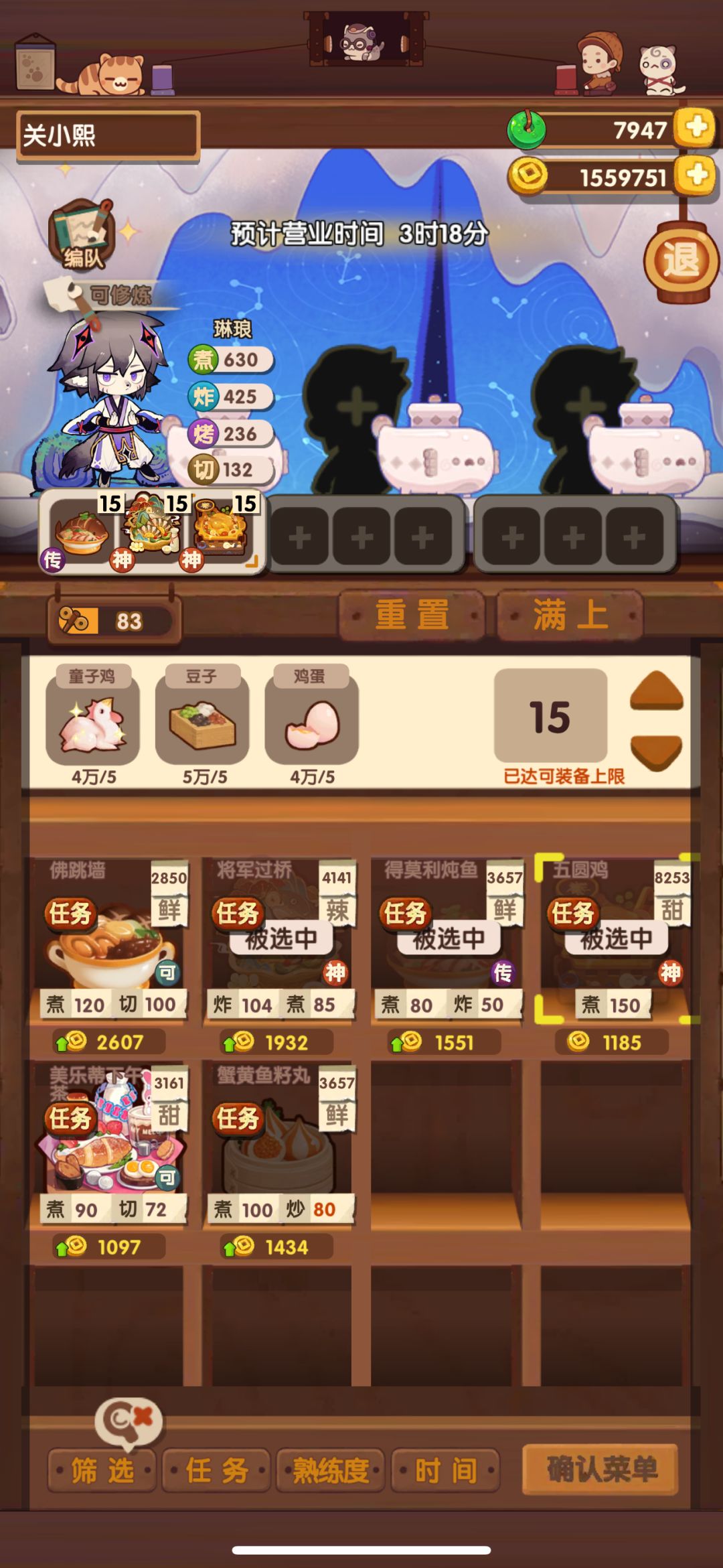 饱食比较难凑 小皇帝 二郎神 小鱿 镇妖是修炼了的 还是建议大家自己先算一下,自己的池子情况自己最清楚,打开图鉴网 按照意图,参考大家的思路,大概抄一下再根据自己的情况微调,实在不行再求助,不然一直也搞不明白是怎么算的。 一号位 选一道酸味的菜 后面跟一火或者五火 根据自己情况来, 我没有“杭三鲜”有的可以上 二号位,不能有做到传说级别的菜,避免减10饱食度,所以这里把二郎神的厨具换了,也可以