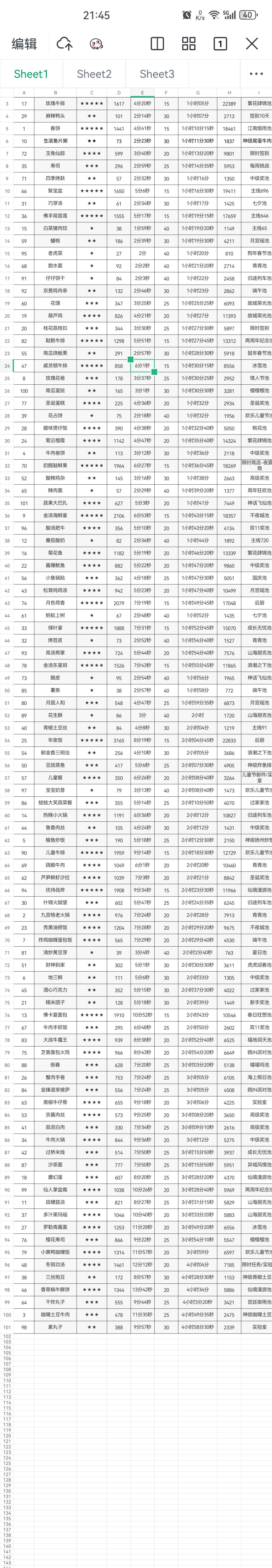 一共25个贵客,100个菜。整理出来99个,还有个小炒黄牛肉是新池子。。图是按照一组总时间来排序的。