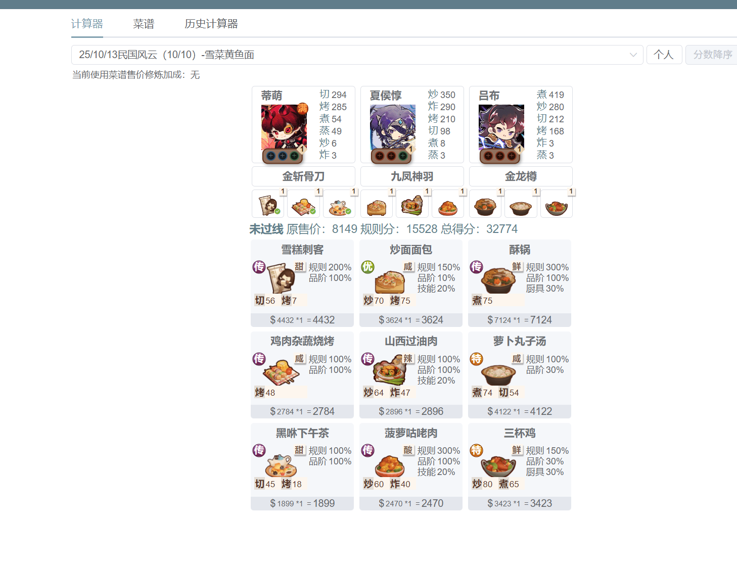 国际惯例的全员无厨具、无遗玉、无礼包厨(坑除外),修炼接近无氪满修炼,具体数值在下方,东西在评论区里。 全员有修炼。 全菜谱无专精,五火菜谱上限17适用,上限17总分3618944,上限18总分3642012,上限19总分3665079,上限20总分3688146,上限21总分3711213。 【作业常驻的限制列表】 *预警:如果无法满档会适当解开限制* 沙县轻食、全套菜饭和月色荷香之外所有后厨菜