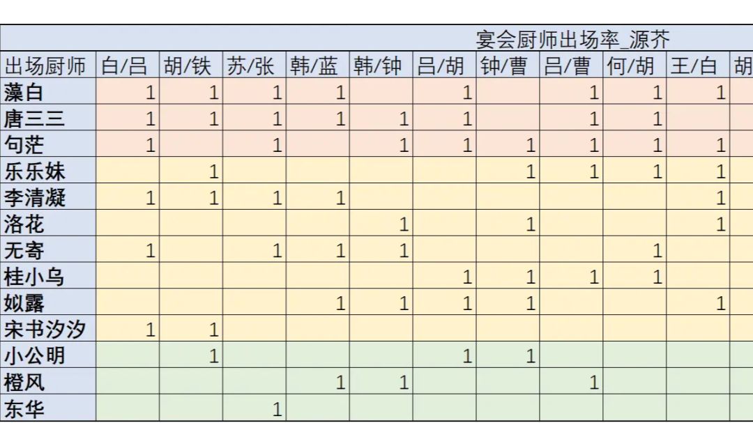今天看到勃勃升肌大佬做的榜,想着自己每次都有省宴作业记录,就也想做一个类似的榜单 先简单说明一下本店情况,929天玩家,收集度77.52%,厨师氪了君清,无限,裘小白,苍女,比丢咖啡豆,能频繁用到宴会的只有清凝,所以对零氪可能也有一定参考价值 (984天79.70%已进行第二次更新) 首先是目前省宴出现的全部组合,共15种 出场TOP3:藻白、唐三三、句茫 其他领域发光发热的厨师:蒸切清凝(可以换