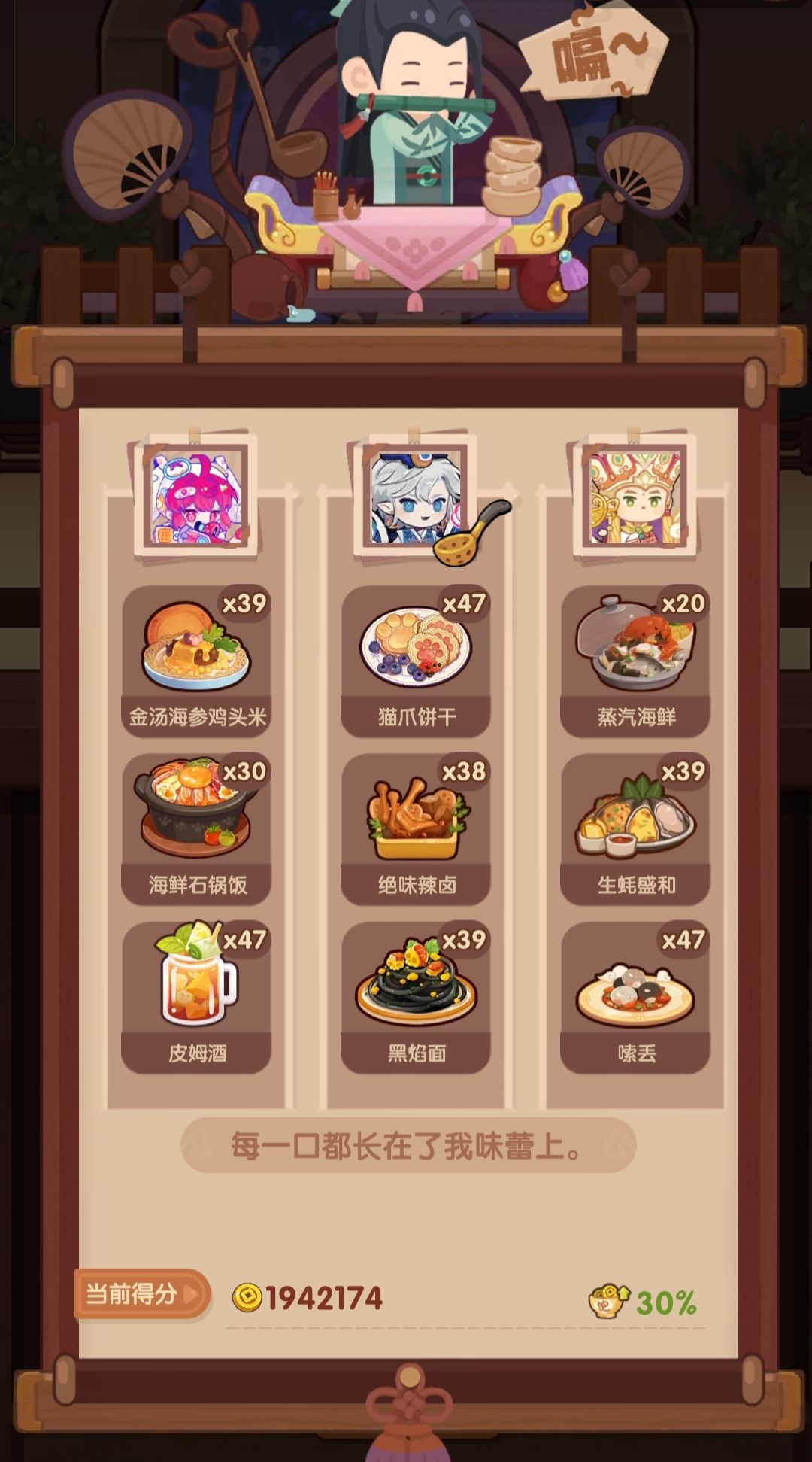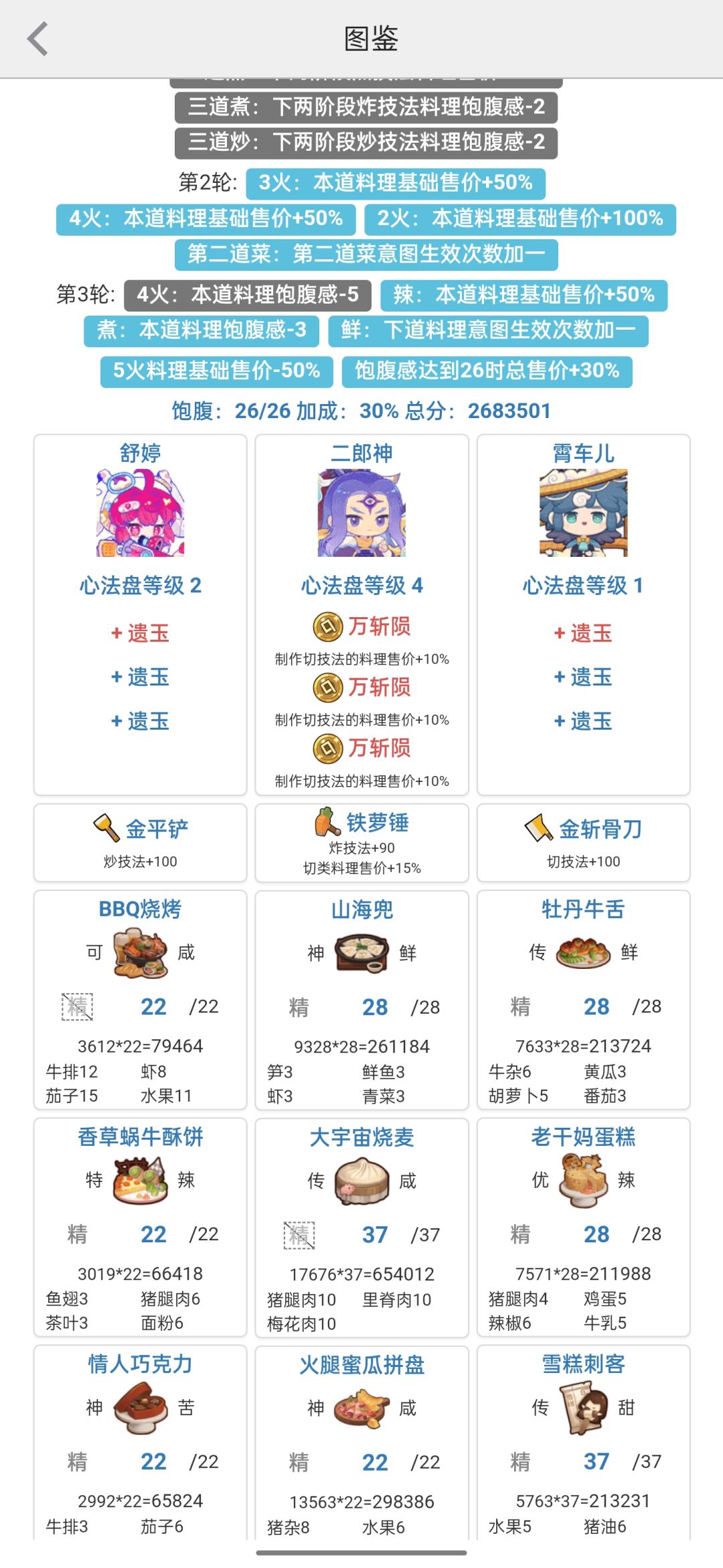 P3可以选择府先生等3火烤切厨,做传级老g妈蛋糕 也可以选择霄车儿,霄车儿肉类+50%售价吃满舒婷和二郎神 二郎神的菜谱比较固定(火腿蜜瓜拼盘可以换4🔥其他的) 舒婷起到一个控制🔥的工具人作用,只要是烤菜就行。和p3互相调整,让p3尽可能上满高分菜,再用舒婷凑饱食度。 舒婷没有修炼的尽可能修一个,用过唐三三都知道,肉类料理高分菜不要太多[表情_捂脸哭](年夜饭,杭三鲜,火腿蜜瓜拼盘,大包子,金汤鸡