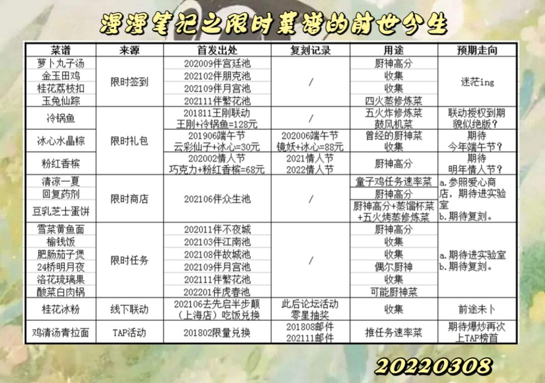 今天看了看依旧没有金符文菜,不知道是不是我手快漏了。这次池子两个三火菜还是挺不错的。 桌子日均收益222,略逊于龙春。 联动活动菜谱:确认了一下真是礼包菜,给哥们整无语了。好在这四个菜都没啥亮点,不备战厨神顶分的话,要这么多菜也没啥用,总之就是完全不建议买的。 五火,大耳狗酸奶碗,炒炸修炼菜,目前来看不是金符文菜。 五火,美乐蒂下午茶,煮切修炼菜,时间也不错,目前来看也不是金符文菜。 四火,美乐蒂