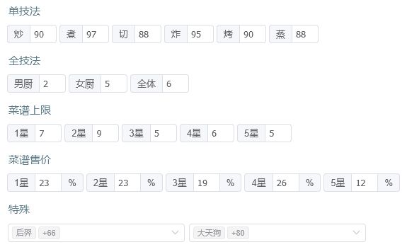 国际惯例的全员无厨具、无遗玉、无礼包厨(坑除外),修炼接近无氪满修炼,具体数值在下方,东西在评论区里。 全员有修炼,全菜谱无专精。 【作业常驻的限制列表】 *预警:如果无法满档会适当解开限制* 沙县轻食、全套菜饭和月色荷香之外所有后厨菜不上场。 生蚝盛和与仙丹不上场。 修炼后的唐三三、藻白、炎罗和二郎神不上场。 如果施加以上限制无法满档的,请自行去计算器那调整菜谱与厨师,我不想用不代表着你也要跟着