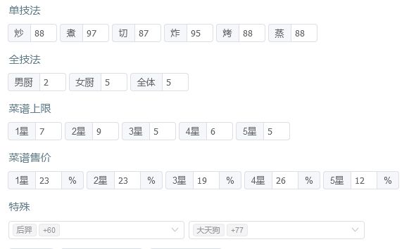 国际惯例的全员无厨具、无遗玉、无礼包厨(坑除外),修炼接近无氪满修炼,具体数值在下方,东西在评论区里。 全员有修炼。 全菜谱无专精,五火菜谱上限17适用,上限17总分3258480,上限18总分3272639,上限19总分3286799,上限20总分3300959。 【作业常驻的限制列表】 *预警:如果无法满档会适当解开限制* 沙县轻食、全套菜饭和月色荷香之外所有后厨菜不上场。 生蚝盛和与仙丹不上