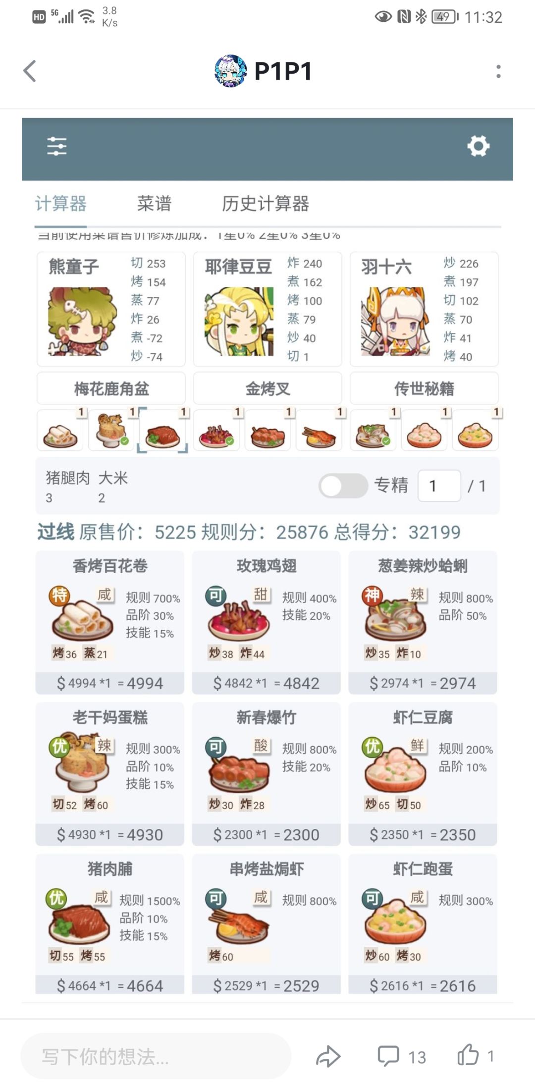 四周年前入坑,本来御10限时任务算来算去过不了,准备躺平了下次再做 论坛看到@P1P1同学的帖子,炒了一下作业刚好过线,这里感谢P1P1同学 两套菜谱相对都比较平民,适合四周年入坑前玩家 首先是P1P1同学菜谱 下面是根据自己情况凑的菜谱,分享出来作以参考 再次感谢@P1P1助我喜加一