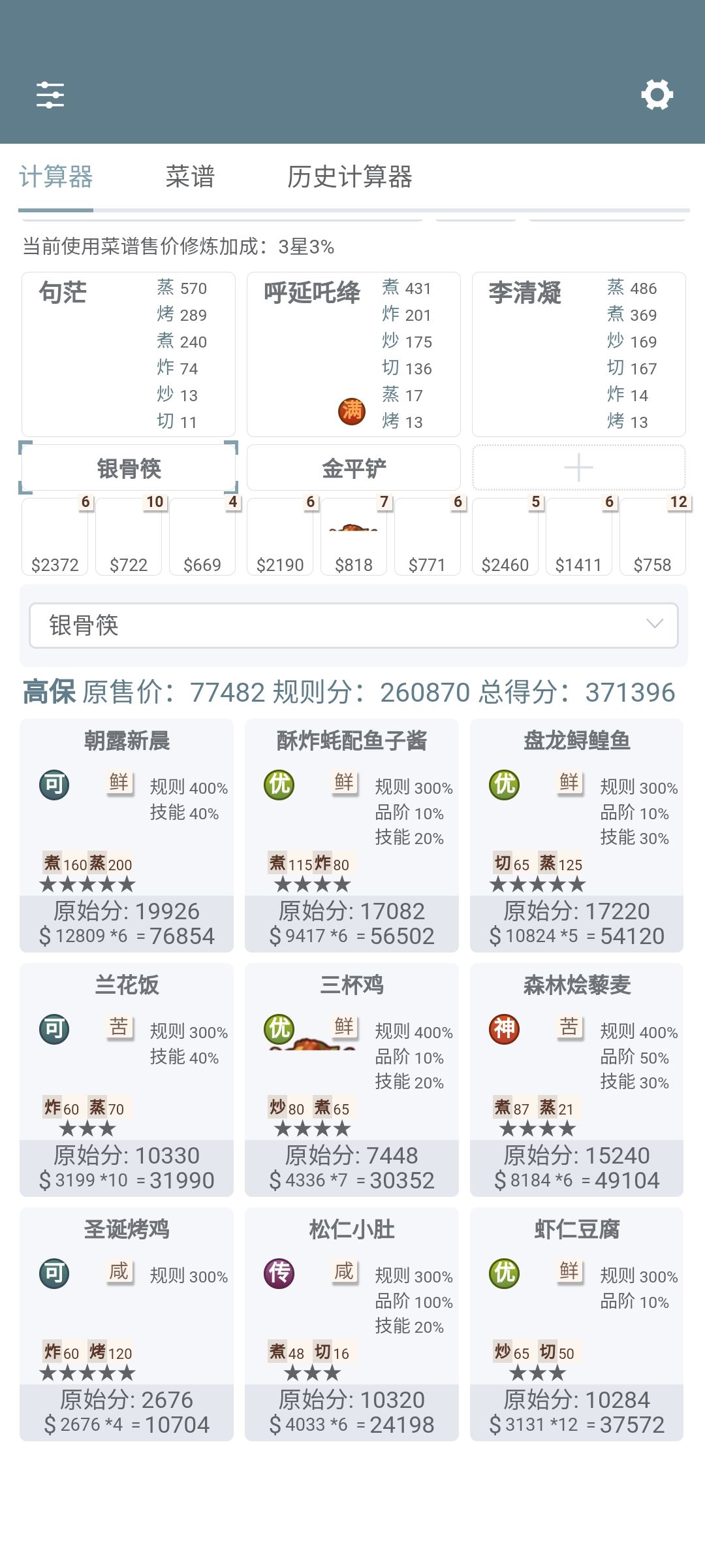仅供参考,部分厨师加了厨具,参考的可以自行考虑上厨具来略微增加分数。