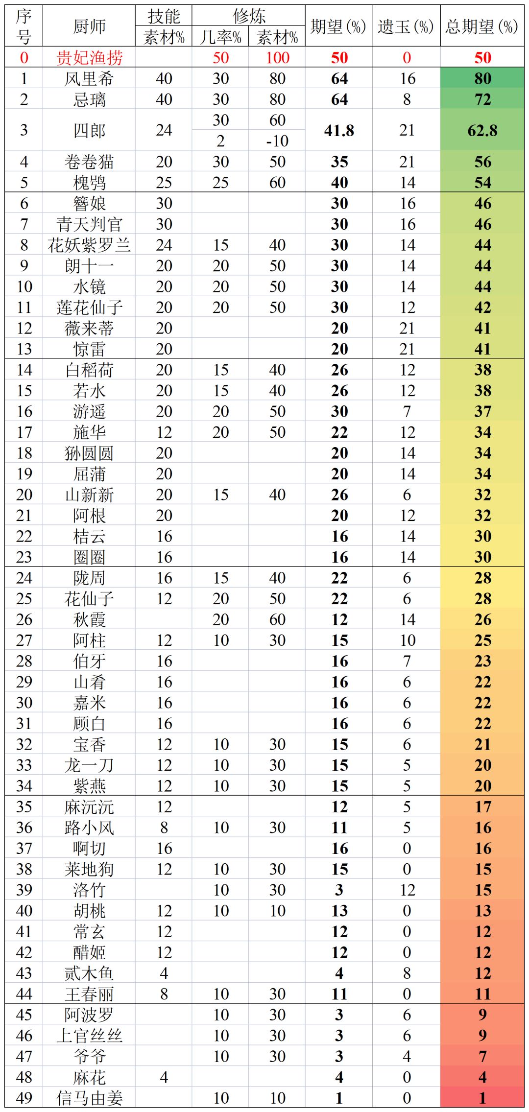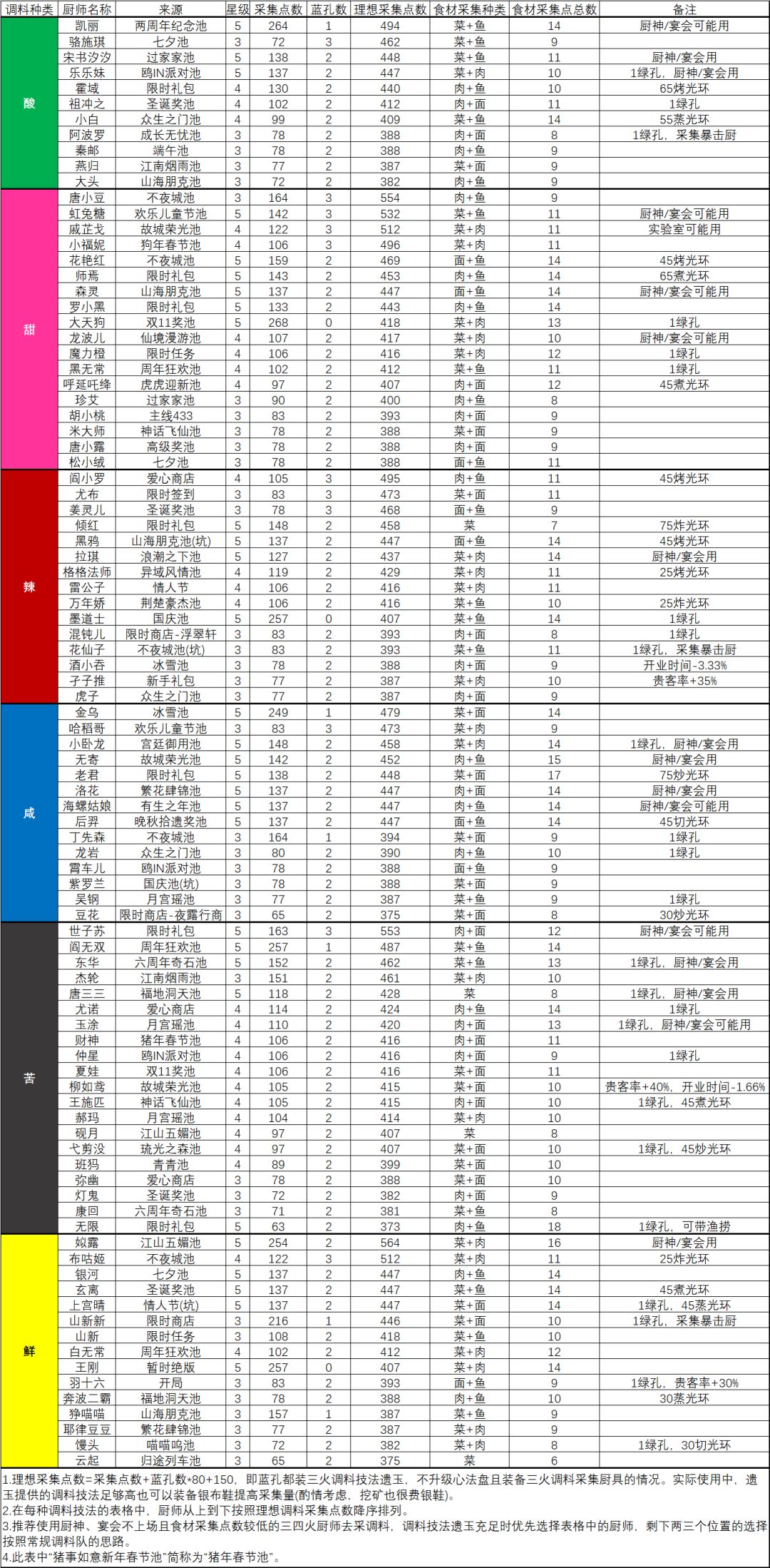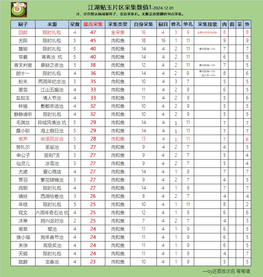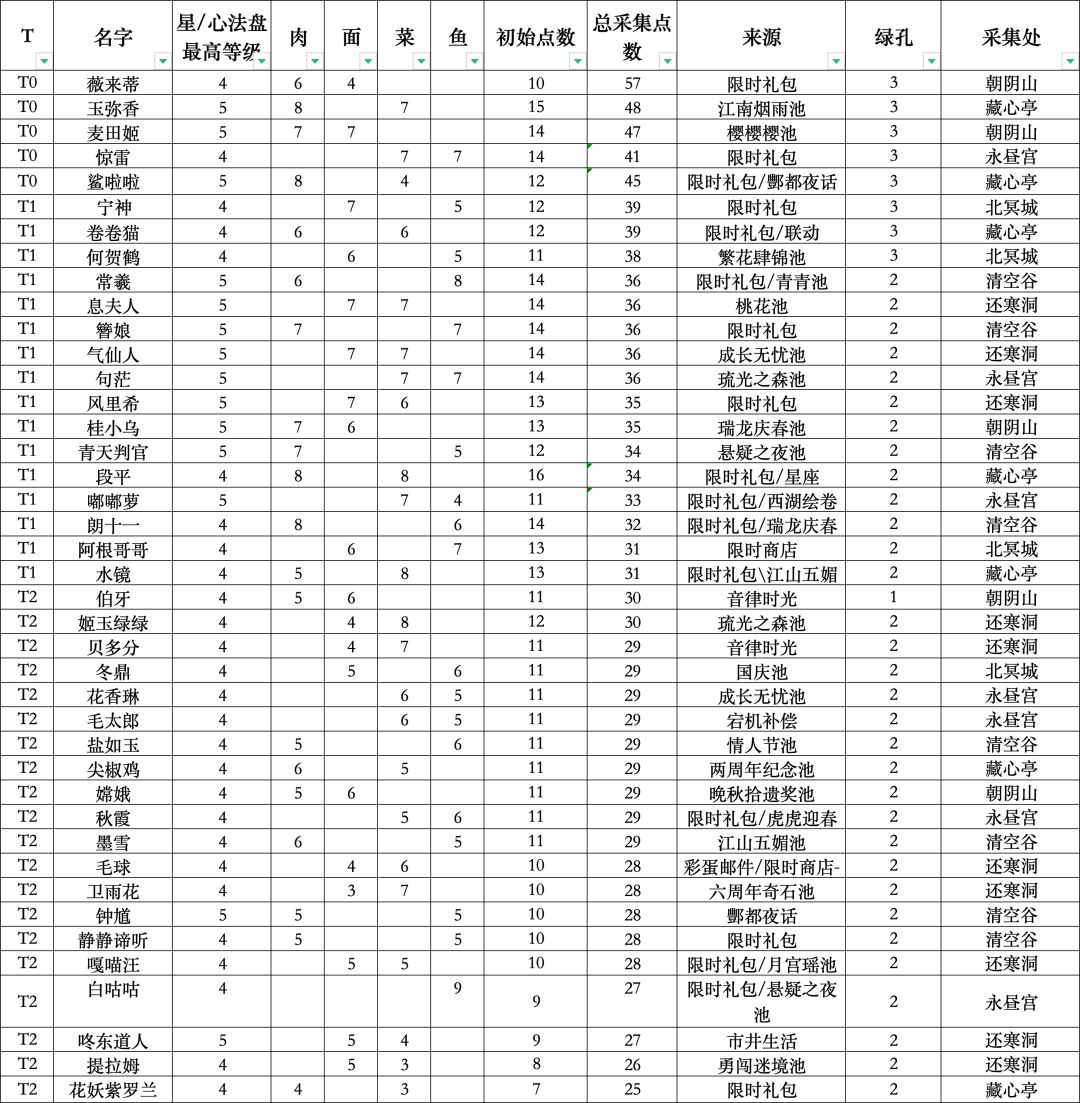做了一个采集厨师的排序,哪个点数高、补什么池子一眼出,红色的是礼包厨。有不对的指出改正,有帮助的收藏点赞。 5月28日更新 7月02日更新 咚东道人基础采集只有9整体素质在T2档,采集点是在还寒洞。 7月27日更新 惊雷限时礼包厨师T0档,这次的江南烟雨池和繁花有两个强力采集厨,注意抽取。 8月12日更新 酆都夜话采集厨钟馗T2档,但是清空谷厨师稀缺可以养,重点注意坑鲨啦啦T0有条件的抽下。 9月