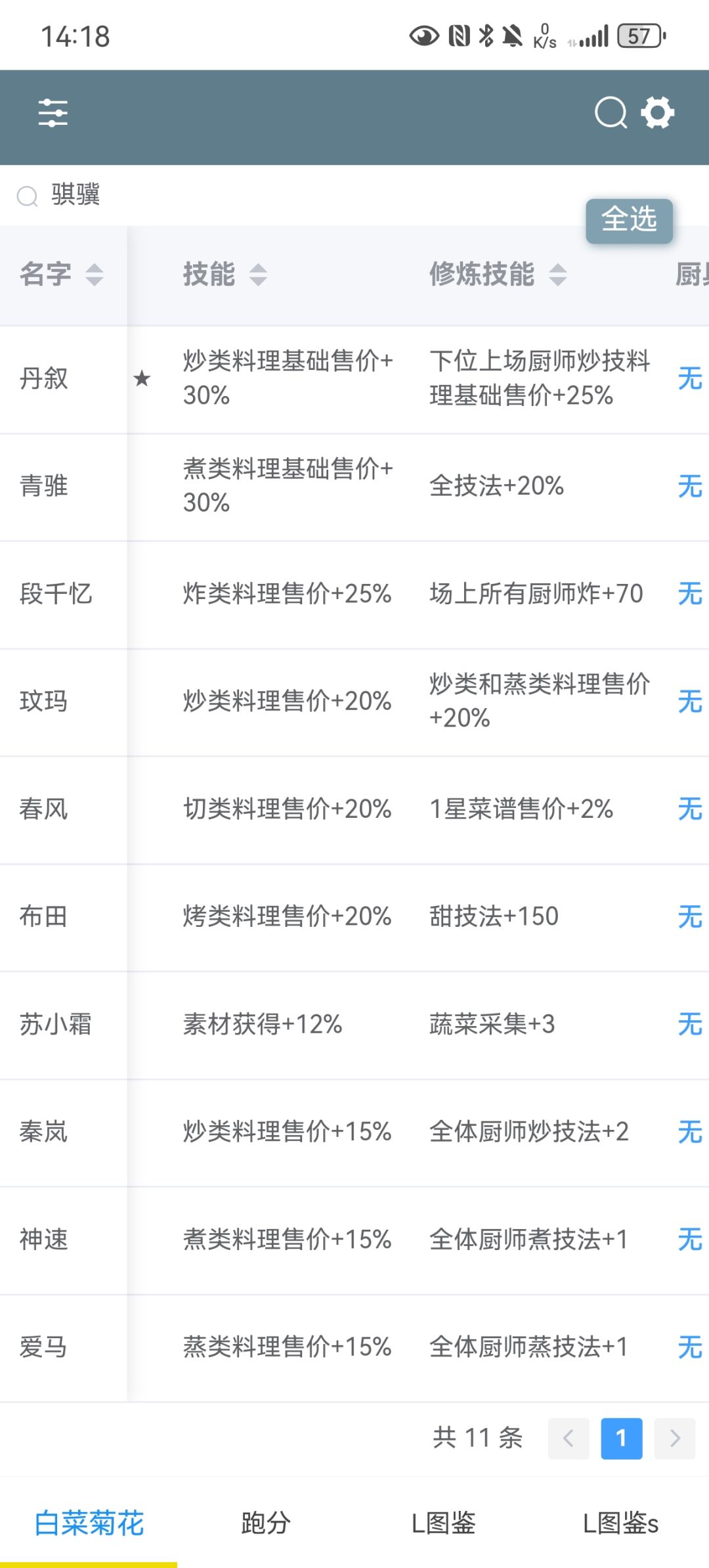 现在玉没有那么紧缺,于是改了几个采集厨下来。图一中数值均为满心法盘无厨具,清空谷不上判官只能用厨具到120。另外框里的厨子为瑞龙庆春之后的双绿孔厨,可以看需求更换 改: 图二左侧黄色是我当前数值,引号内是刚开遗玉装的银鞋。到现在也只开到13个3火遗玉