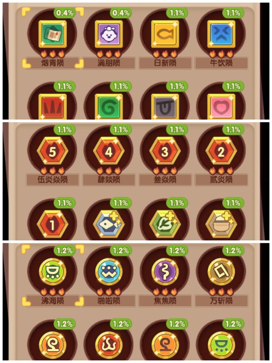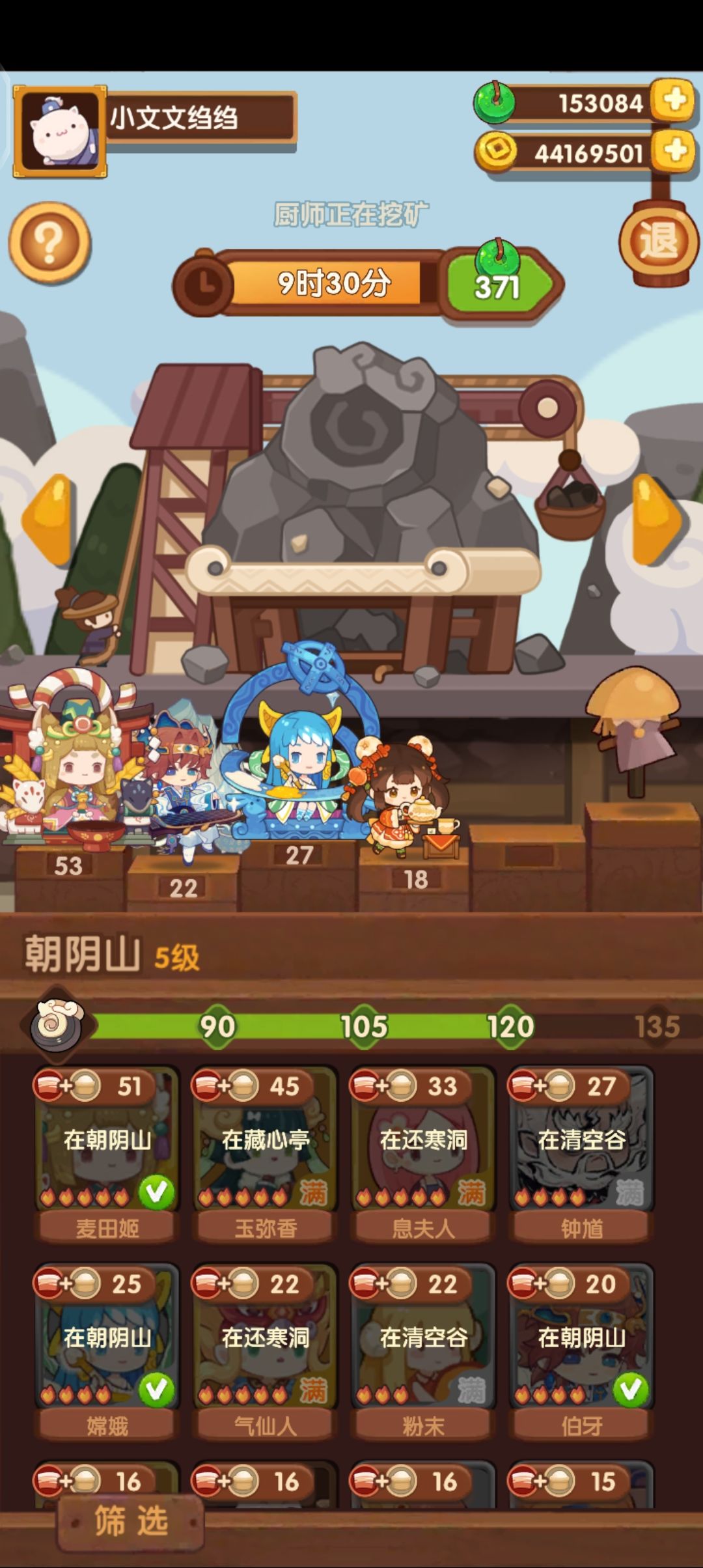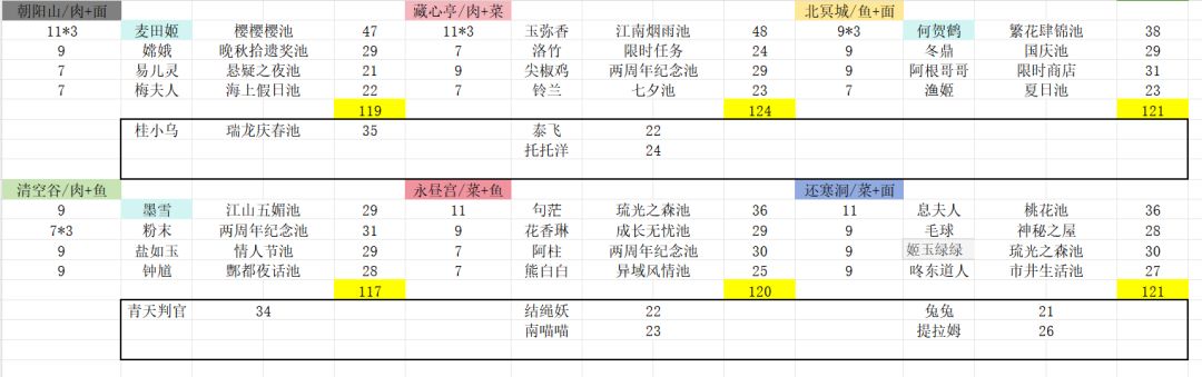 1.朝阴山已经120点,已经毕业,后续如果有三火采集遗玉,可以给伯牙和嫦娥装备,桂小乌现在用的席丰玉,如果以后宴会上阵机会少了,可以装采集遗玉 2.永昼宫90,主要没有能打的厨师,希望后面新池能出给力厨师 3.还寒洞120点毕业,前三个基本够用了,有更强的可以替换常鹅 4.北冥城90,厨师还可以,主要是缺采集遗玉,刷到三火采集后,需要优先提升的 5.藏心亭105,前两个厨师可以,后面两个有替换空间