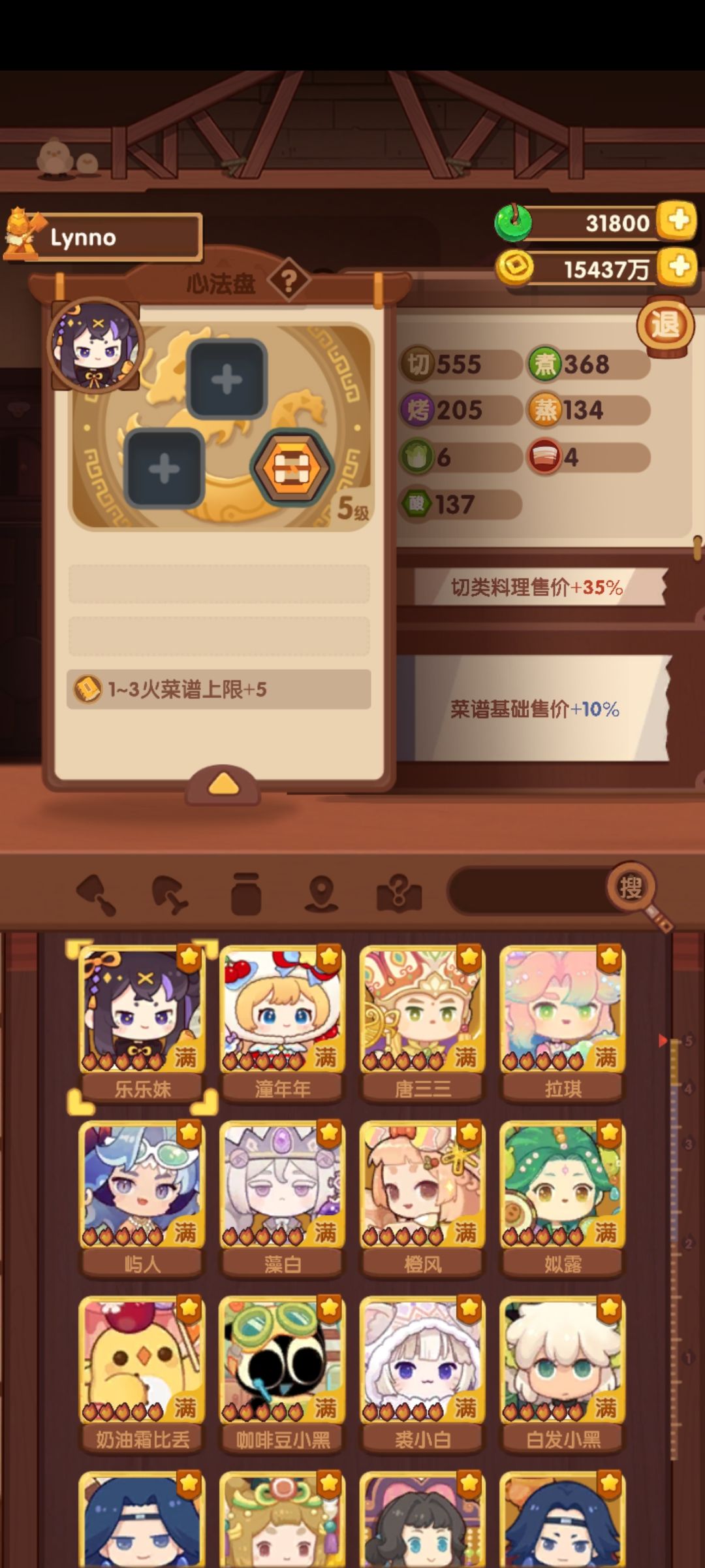 随着采集玉越来越多,目前已经升级了4个满级心法盘和2个4级心法盘以及很多2-3级的心法盘。 五火心法盘 心法盘符文递增5-8-12-15 玉片200-250-350-450 前三个是宴会常驻厨子,乐乐妹、橙风和咖啡豆,都已经是5级心法盘,遗玉配比如上图。前两个有加上限的孔加成很大,咖啡豆可惜的是没有加上限的孔,但技能50菜以及技法广泛弥补了一些差别。 小黑暂时没有玉,只是因为辣太多了,所以升满了。