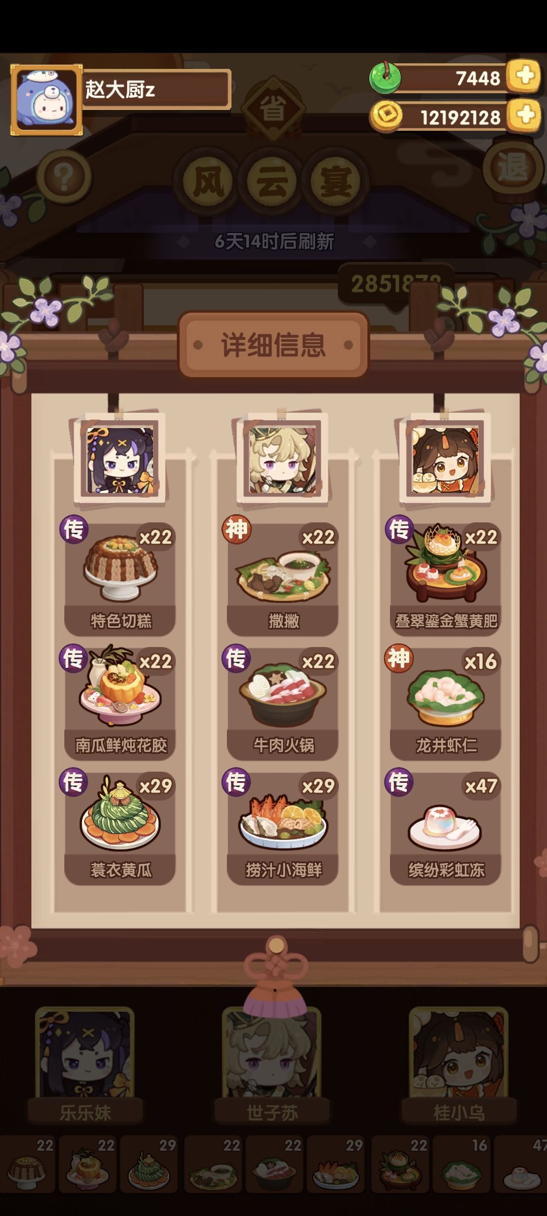 51w分。 欧IN池子里拿来的菜谱还是实用的,风云宴就先用上了。 老干爹蛋糕真的厉害,在前期能用好久