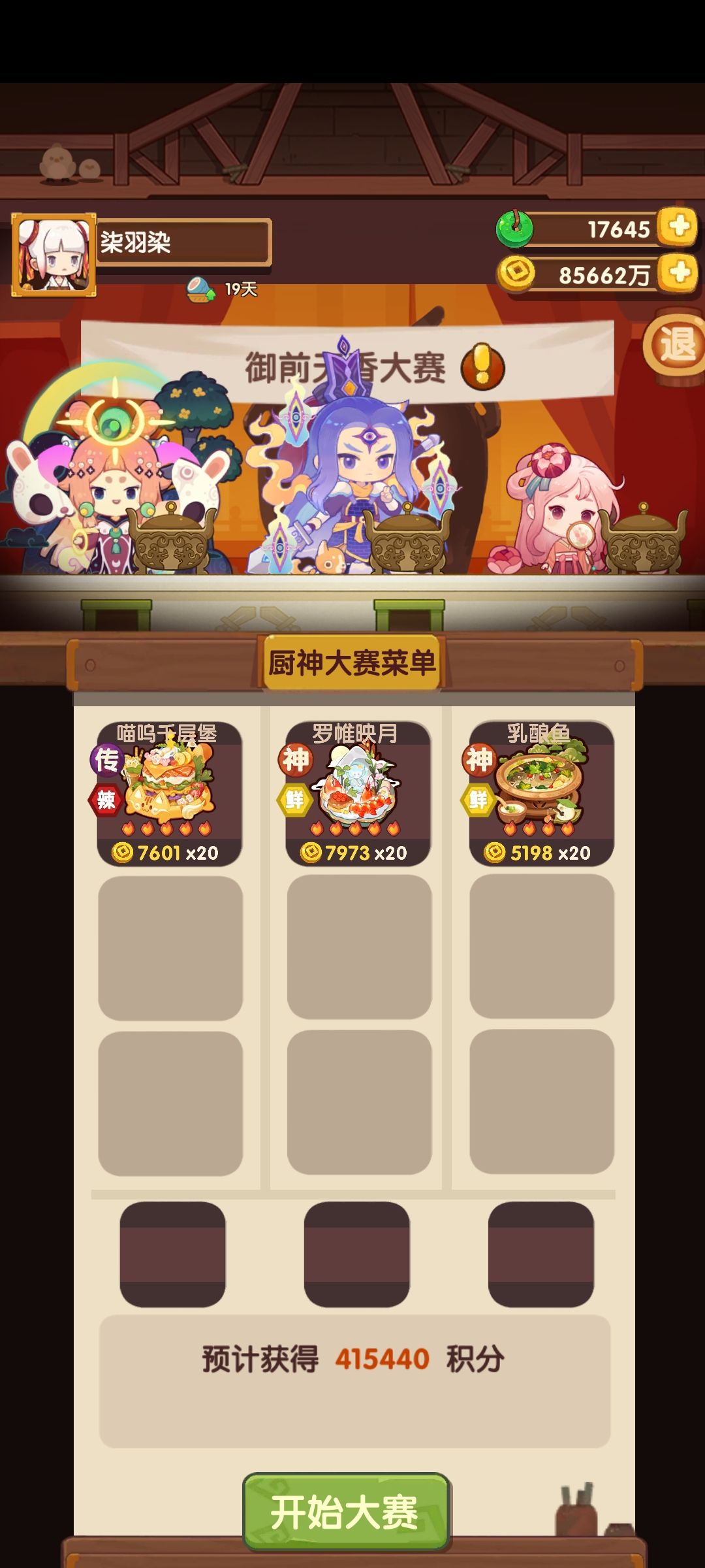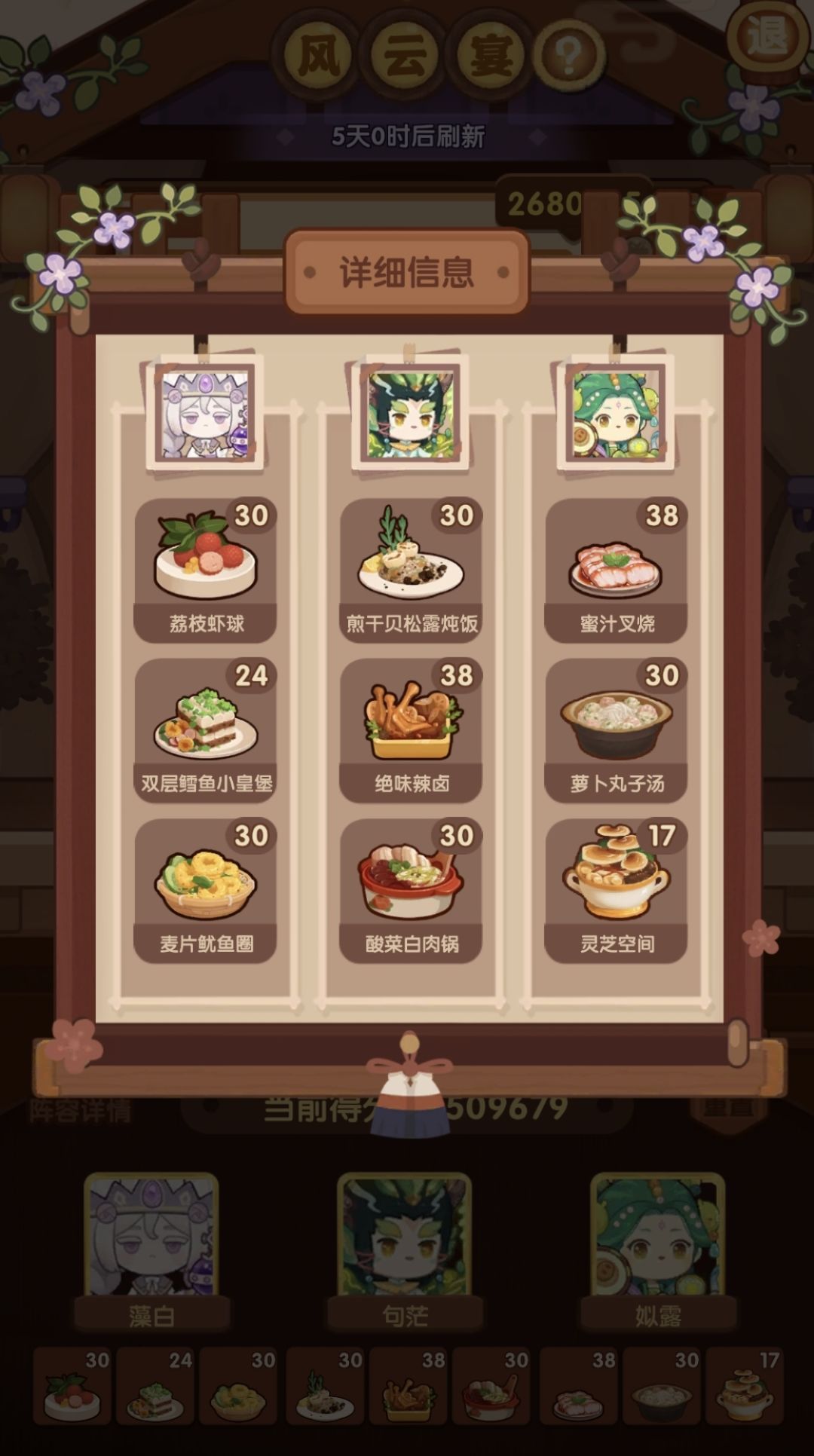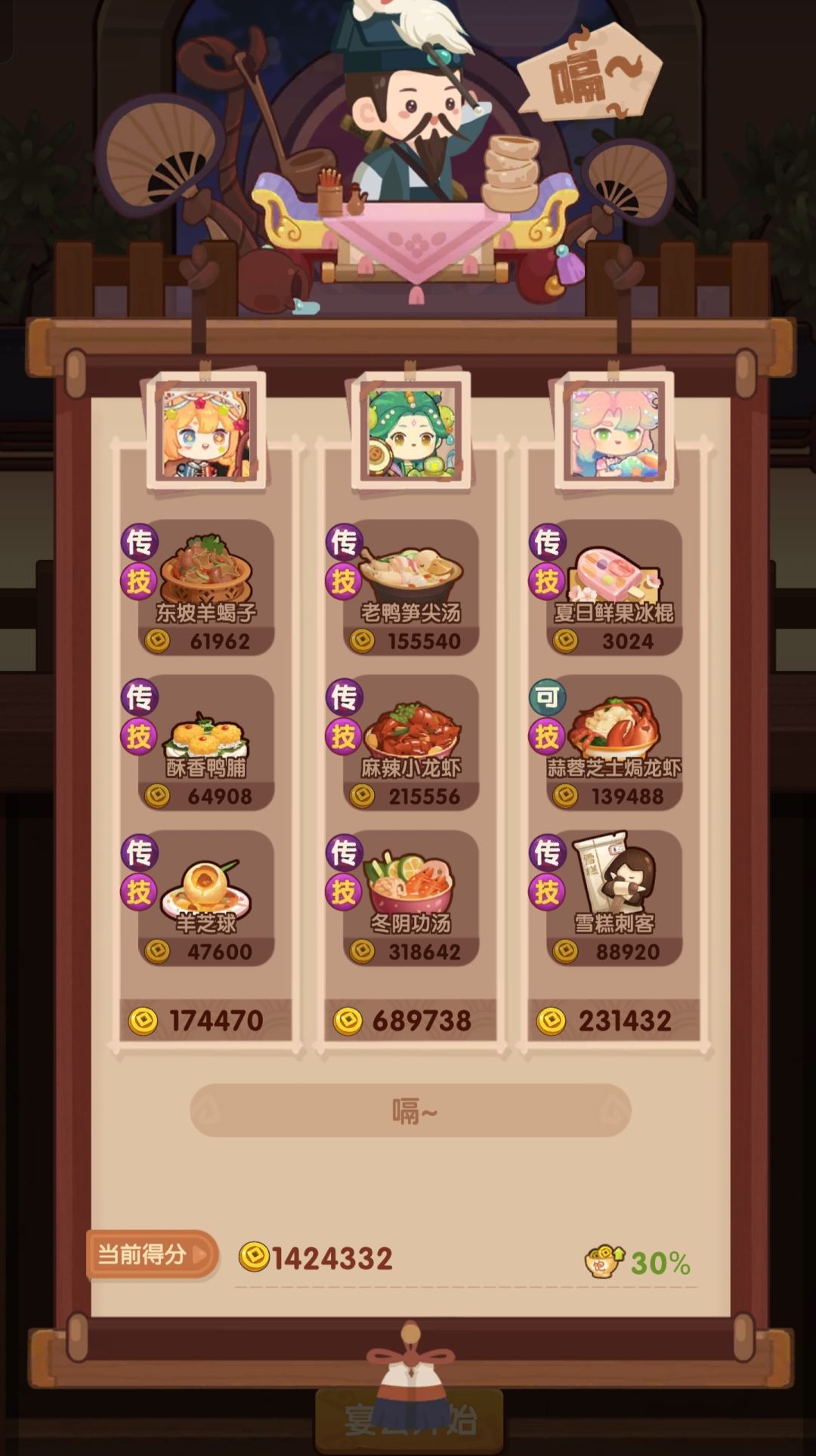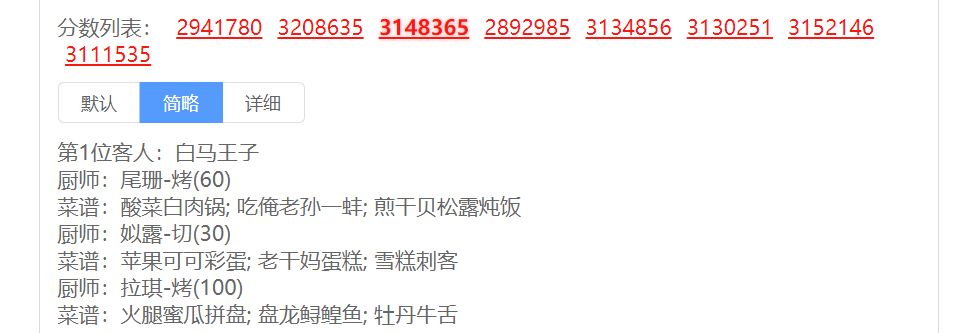 前排提醒 ①由于是擦线过,该方案仅适用3,4星菜谱上限≥我的玩家(三星3,四星3),其他上限影响分不是特别大。 ⭐️P1需要双十一的麻辣小龙虾,下位是薄荷牛肉卷,P3需要儿童的风味塔克,橙风的第三个五火菜上位是龙虾盛宴, 蒜蓉龙虾上位是烛光晚餐,羊蝎子上位是银鳕鱼,酥皮蟹上位夏日海滨或柠檬蒸鱼 ⭐️附上厨具 松鼠🐿(烤或炸售价+20%,占分低,无松鼠可用其他烤炸厨替代,如帝桀) 姒露(银锅铲,如果