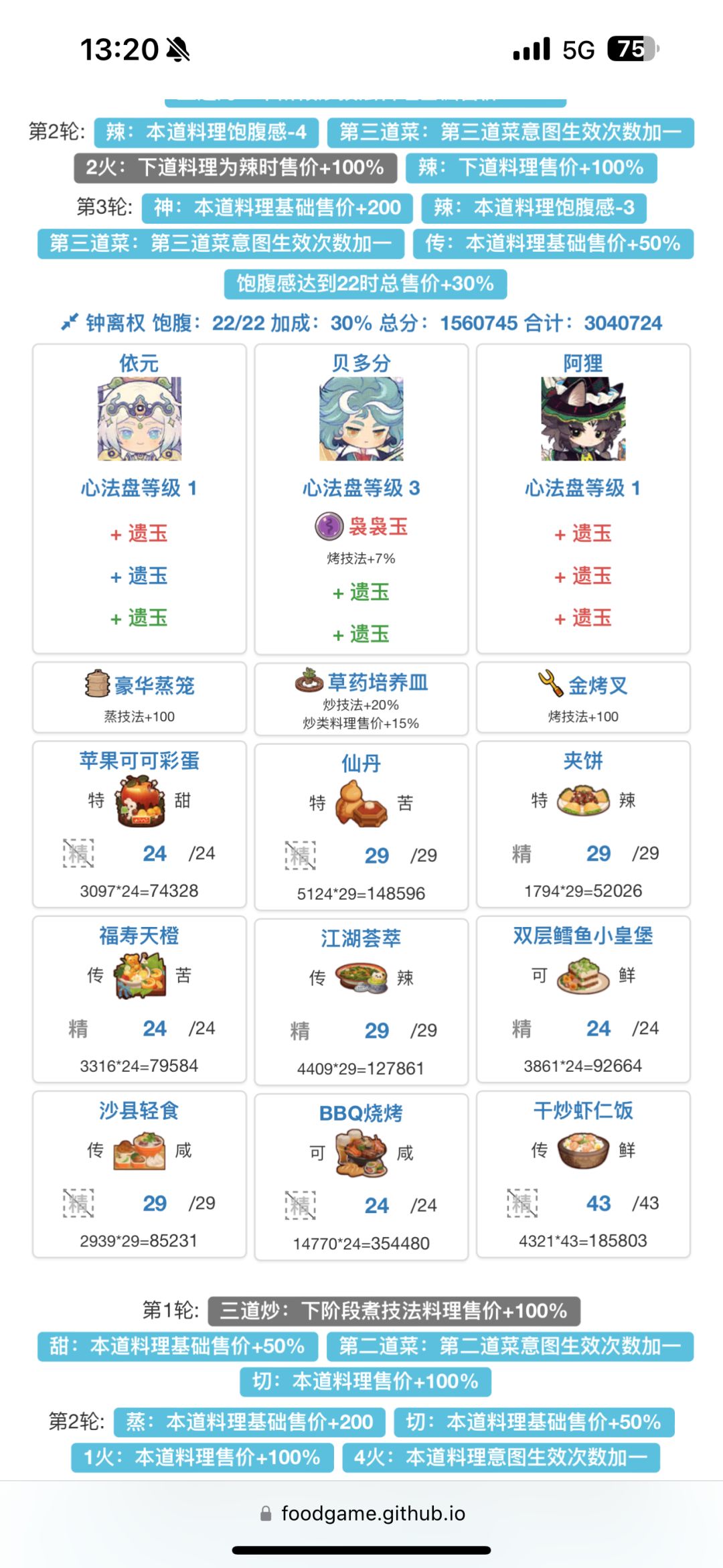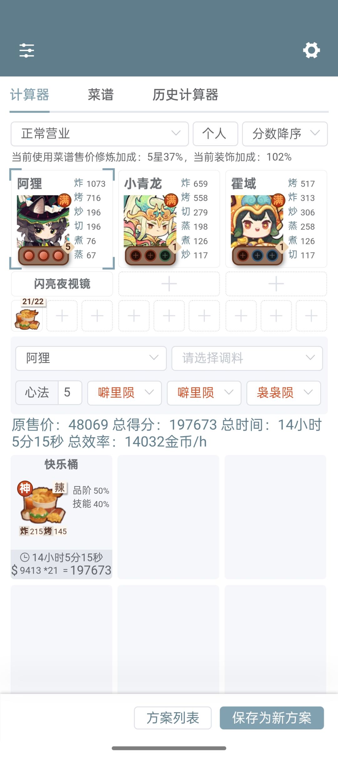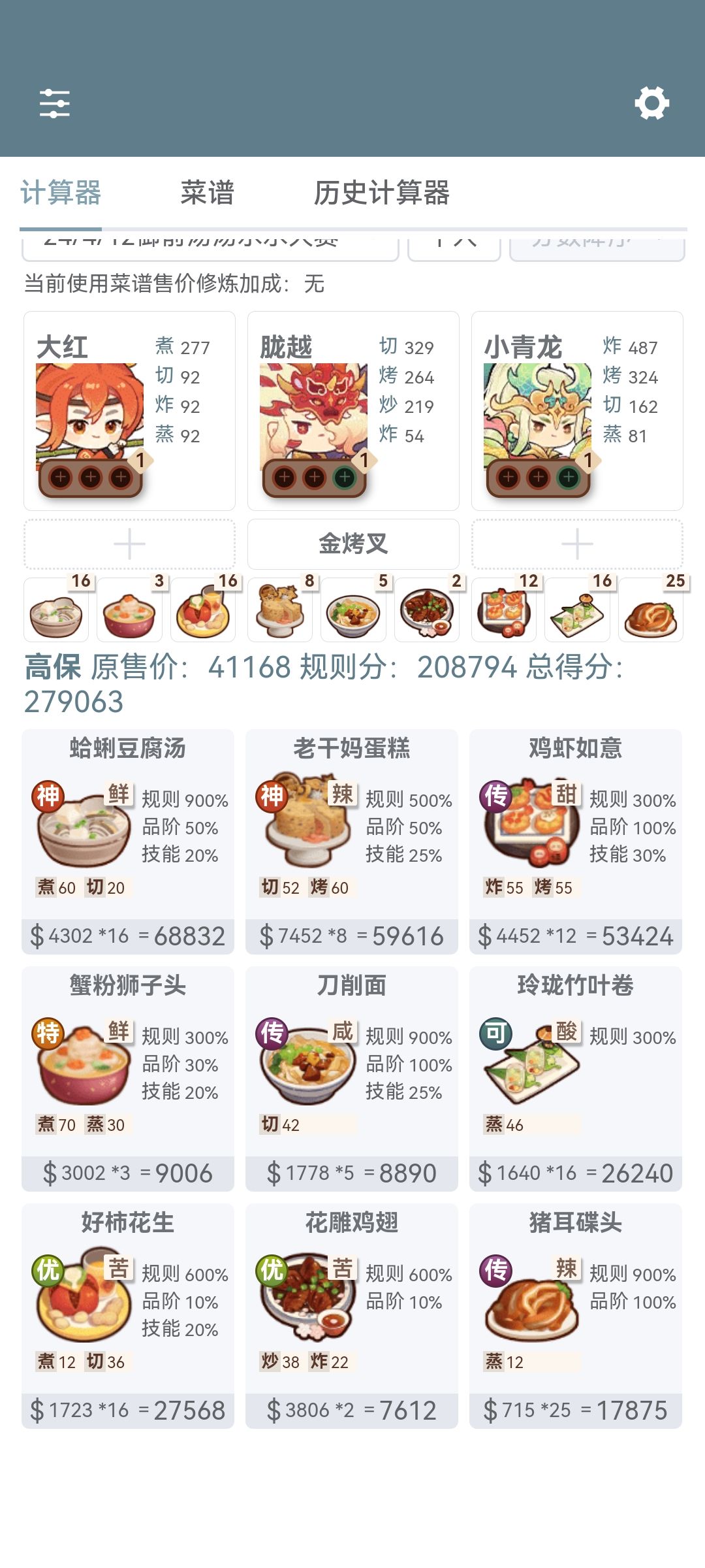 感谢大佬们辛苦维护计算器~ (大佬说网页版计算器还在调试,不着急的宝子们可以耐心等一等) 这次不能省食材咯,算了一天终于满档啦,没有年夜饭和蒸汽海鲜有点艰难[表情_羞涩] 回去还是得接着刷专精,关键时候是真的有用啊啊啊~[表情_泪目][表情_吃瓜] (顺便凡尔赛一句,新电脑💻真不戳,跑分不求人哈哈哈~[表情_大笑]) 【第一份】 【第二份】
