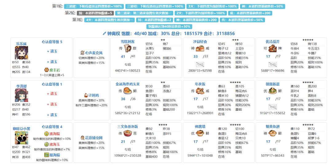 风云宴大号一档311w分,超过一档线26w,遗玉都基本上是高配了,席丰玉加上限依然是最强遗玉,厨师和三火厨具都固定了,以后不怎么会变化; 小号一档271w分,一档差十几万,分析了一下和大号差别,一个是氪金厨师以及厨师修炼,一个是售价基修,一个是厨子心法盘等级,特别是尾珊技法低以及藻白没有修炼,心法盘都低1-2级导致菜少几个,还有五火上限小号只有15,大号有17。综上来说,小号和大号的修炼和厨师区别