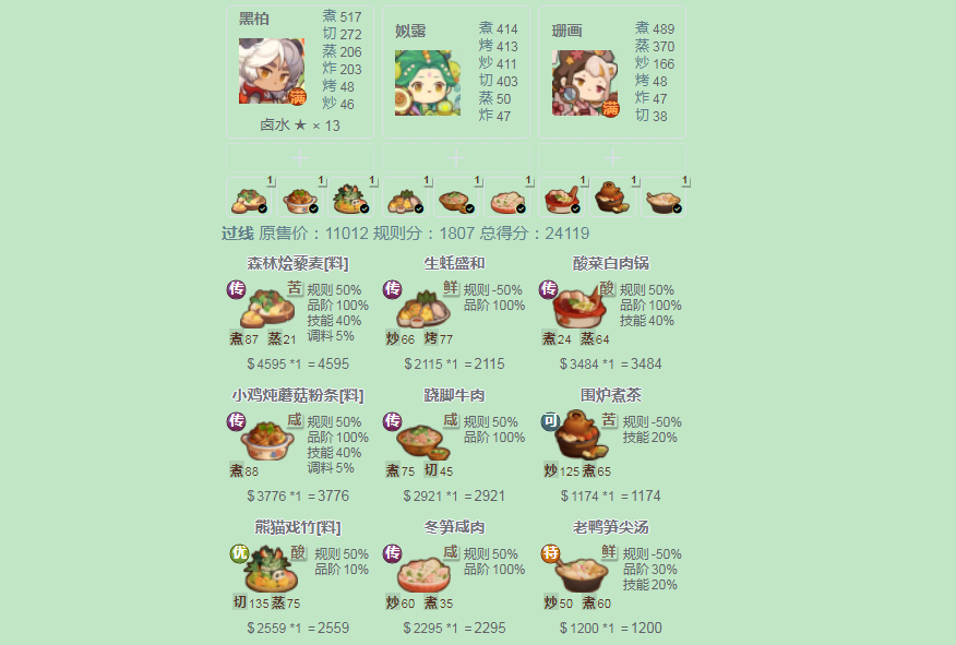 感谢大佬们辛苦维护跑分计算器!!! 大声喊,我们的目标就是省食材!!! 绕开了大部分珍惜食材,用了一点平时不太常用的冻鱼~