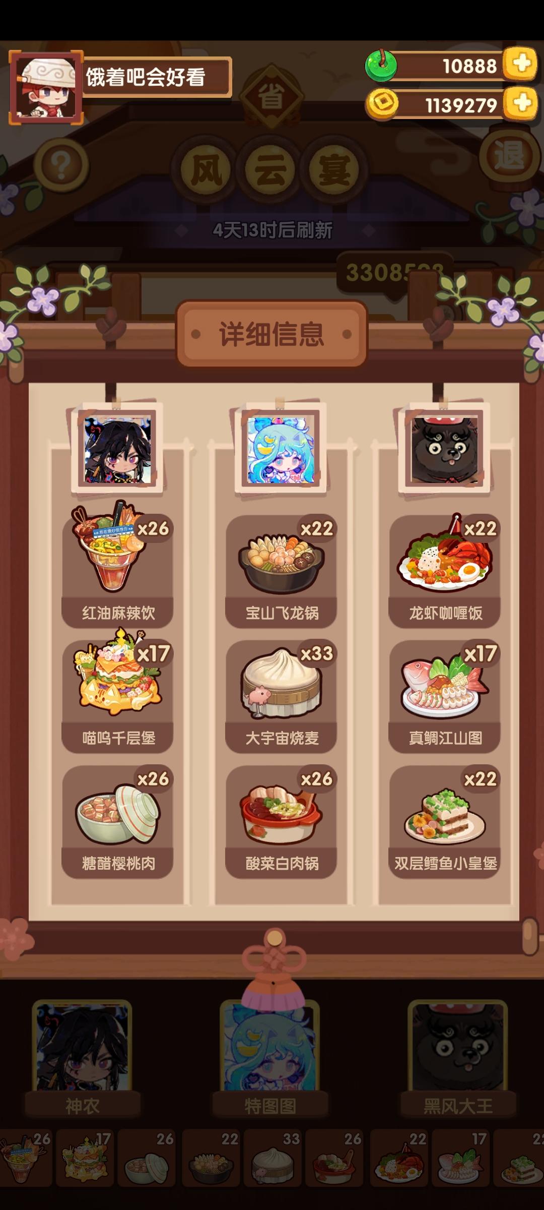 目标如下 估计可以反复刷,所以要省食材(看你啥多,我也刚玩没多久,就看自己啥多上啥了) 1.第一关选个蒸咸1火菜 2.第二关选个1火鲜 3.第三关选炸 (如果配置高估计第一关就能拉满了,低配也能第二关拉满) 之后满足全部饱食度增加的需求(只上一份就行),之后缺的饱食度再用高火一份拉起来 大家根据自己不同食材剩余情况和配置来搭配吧