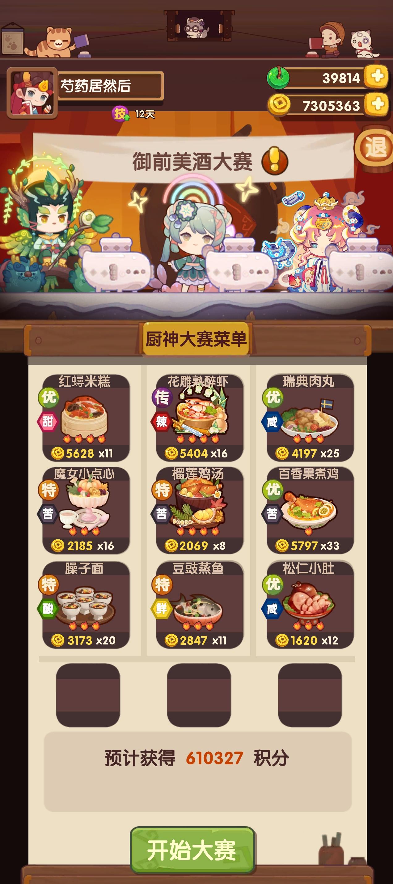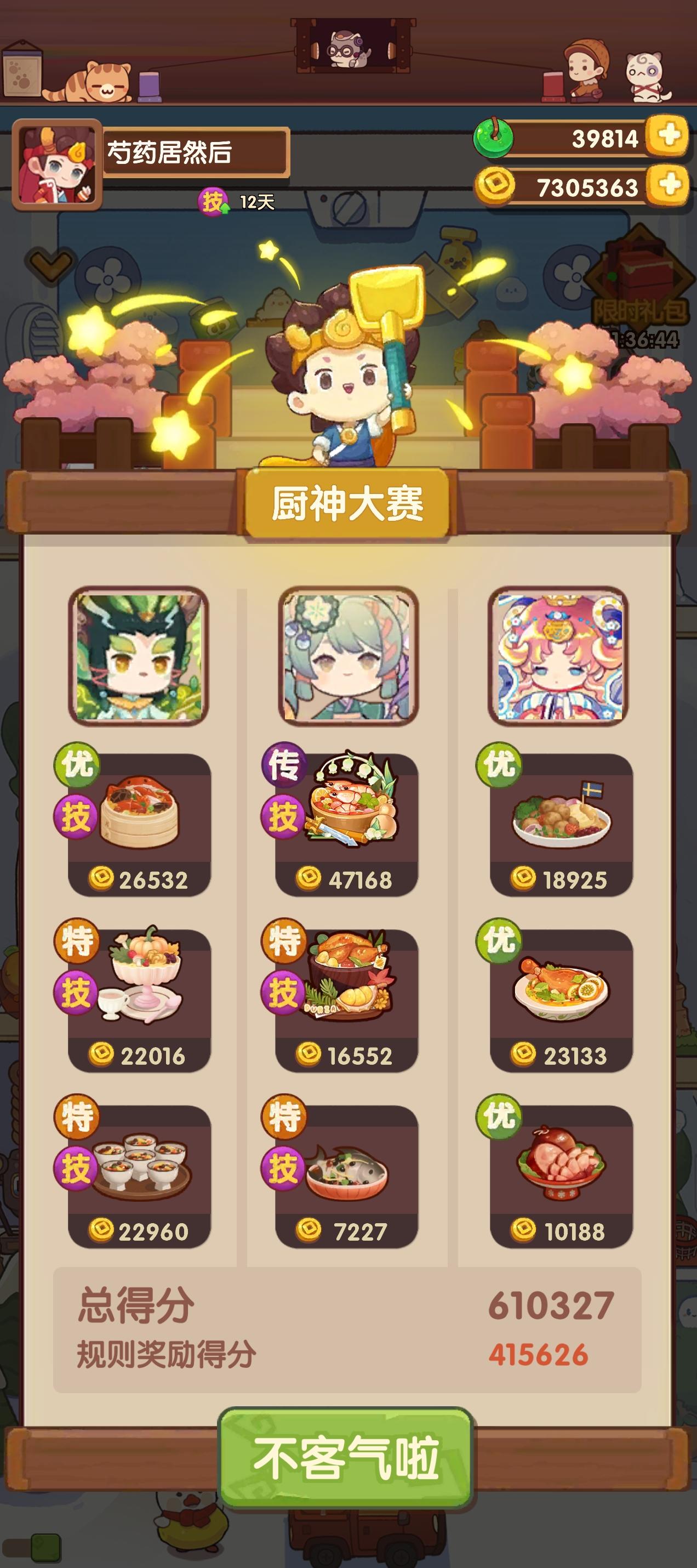 大号73发结束,玉璧拿下琳琅不出问题,但又在思考到底要不要抽 有没有必要抽。后续的坑有点重要,涉及贵客厨重组,但不知道怎么优化。 然后素材厨的坑也有点想抽。小小号75发还差几个装饰,尽管可以不抽,但剩下几个的装饰的金币加成对我这个萌新号有点重要,今晚收桌子再换桌子。