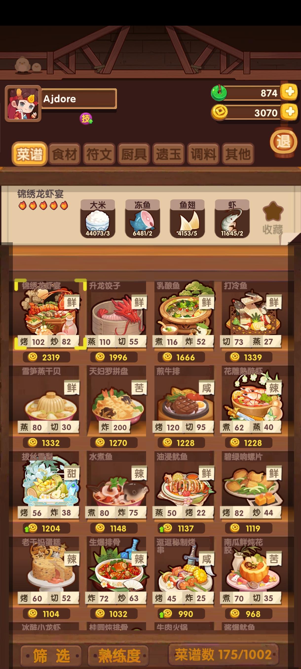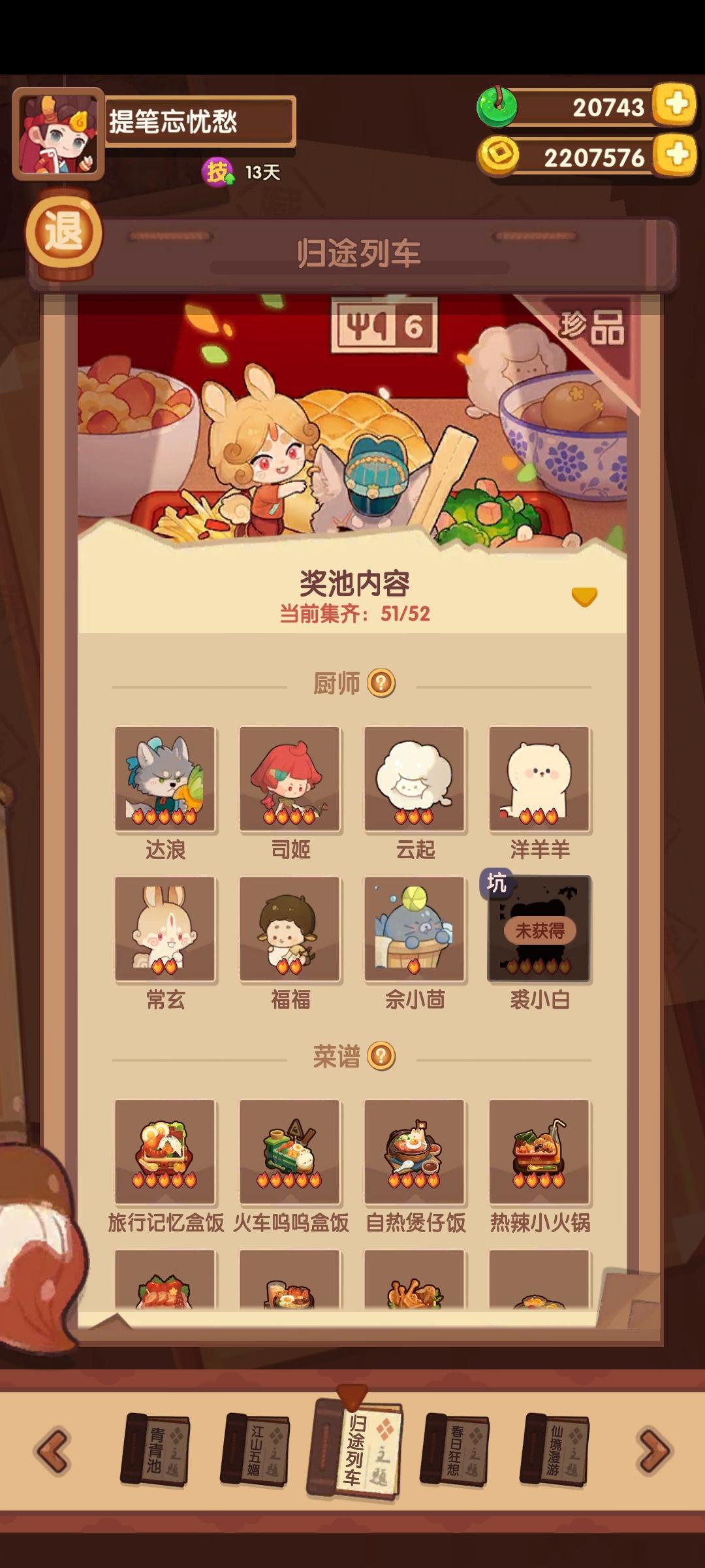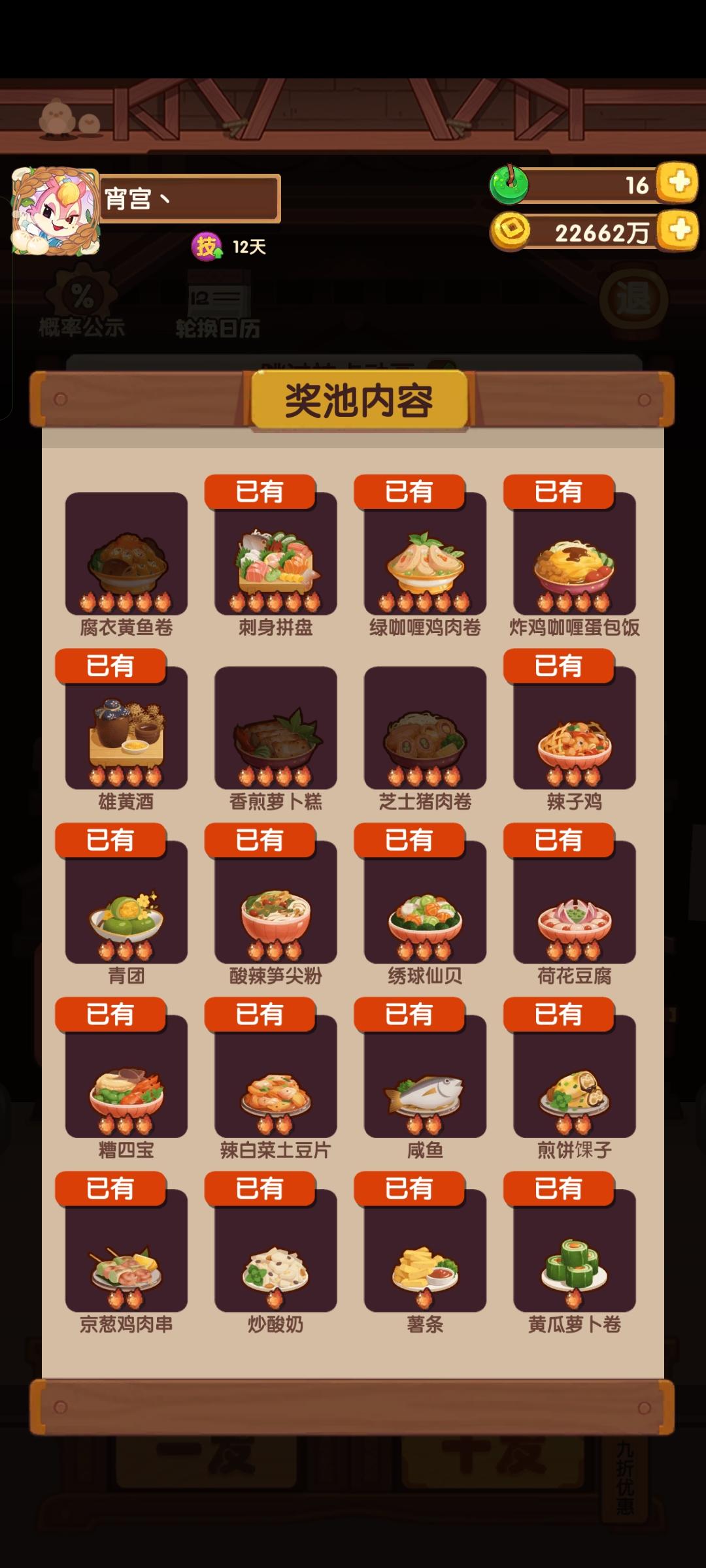 上个新池抽完剩16000玉,这次新池抽完剩23000玉,加起来总计40000玉全部投入进了端午池,想看看能抽成什么样,结果是,厨师还剩郭福和两个坑,菜谱如图还剩三个。想问下佬们,后面五六万玉就只抽这几个吗,前置菜基本都抽完了,再投入这么多玉抽这几个值不值,还是先去抽别的池比较好。
