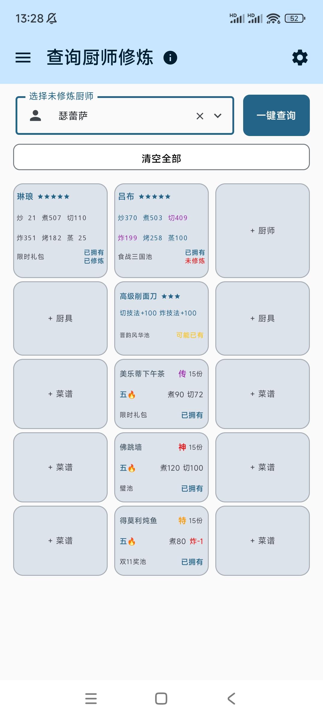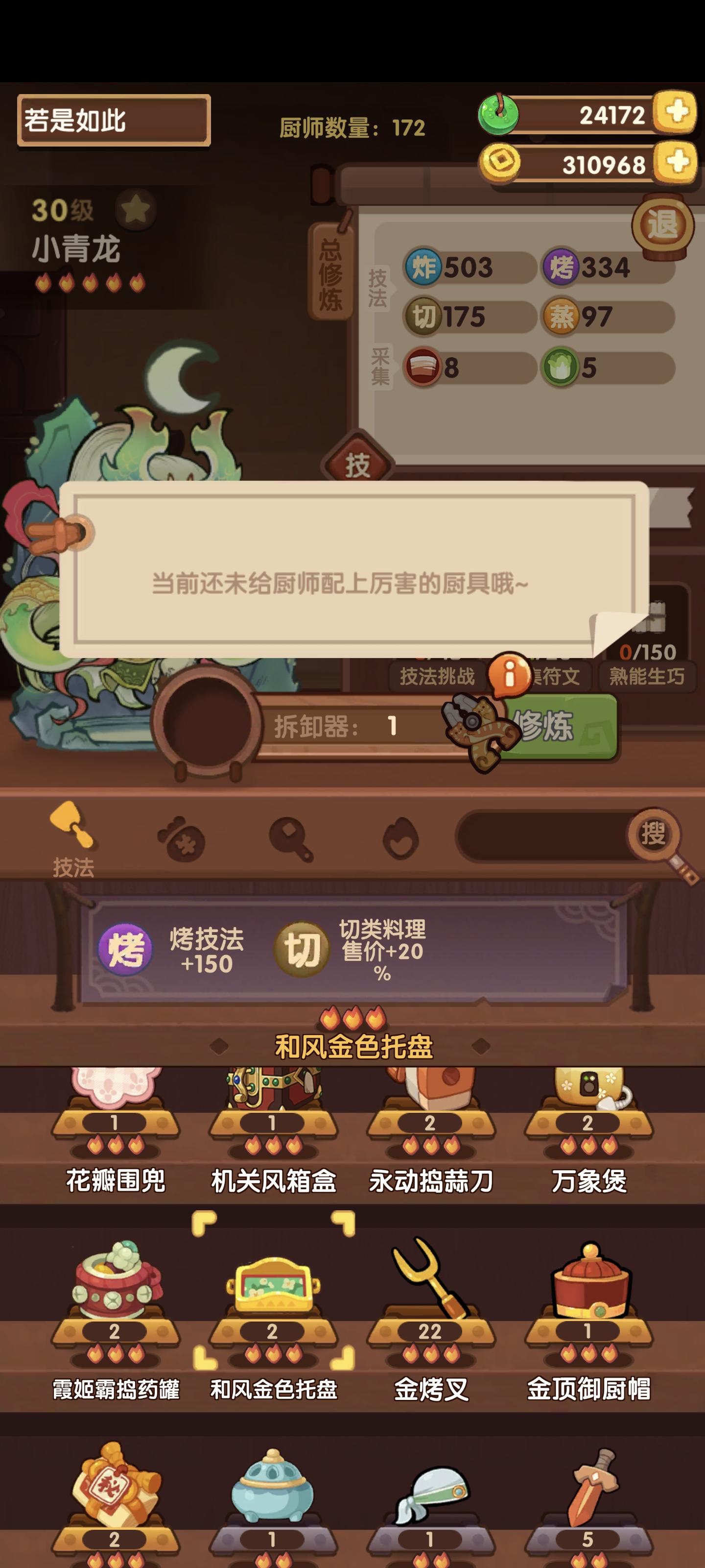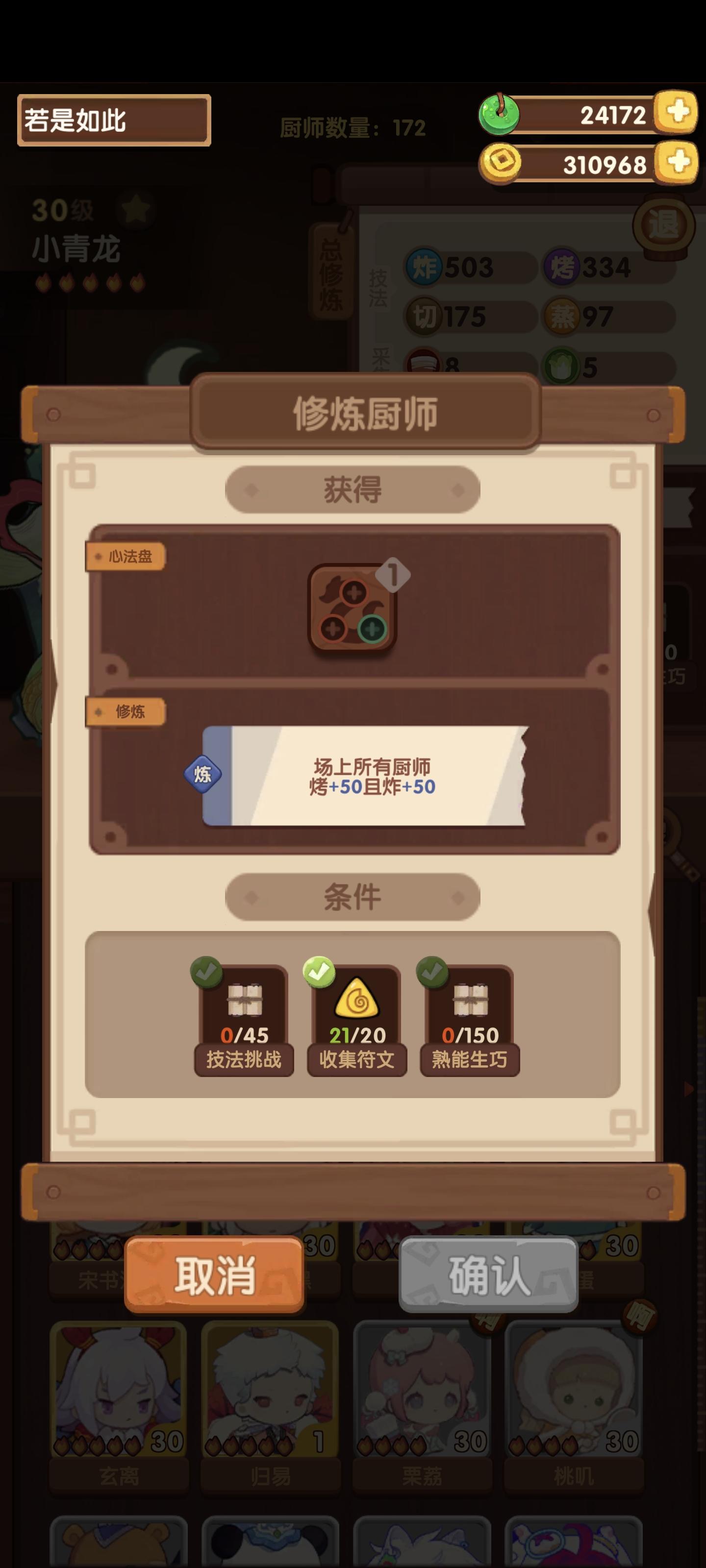 ⭐️发现现在大量修炼非常缺符文所以研究了一下修炼过程,根据已有的五火菜尝试修炼白发小黑(关羽已达标,正在修)①修炼执笔人(如图一)获得光环切50+蒸50②带执笔人外加烤切+80的厨具(雨花剑)修炼小青龙(图二是无厨具光环欠缺的)③修炼小青龙光环烤50+炸50(图三),比对了一下白发小黑(图四)所欠缺的数值算了一下,场上带上小青龙的光环,一条龙够了,香草草排差106烤,其乐无穷差154烤,